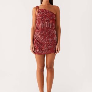 Temptational Beaded One Shoulder Mini Dress – Rust
