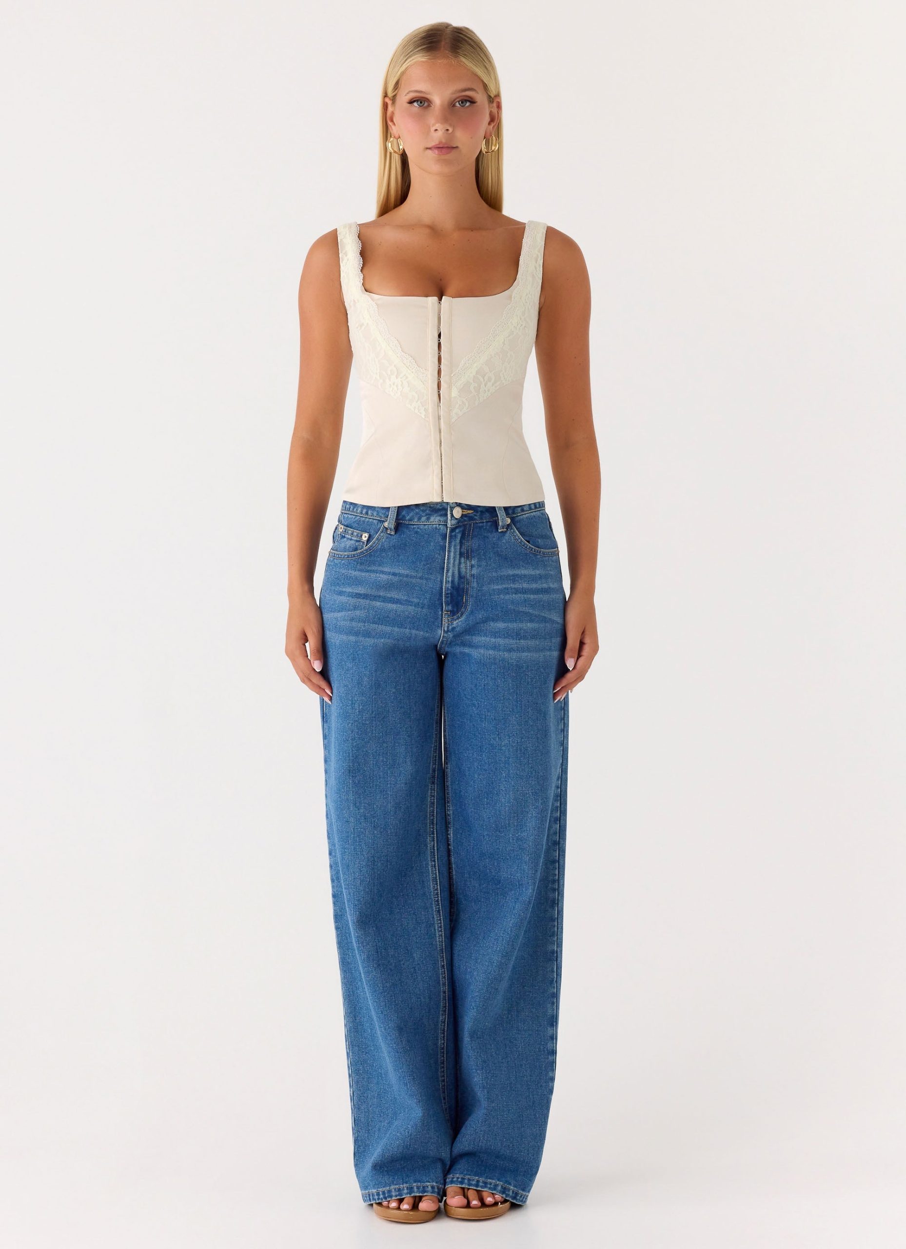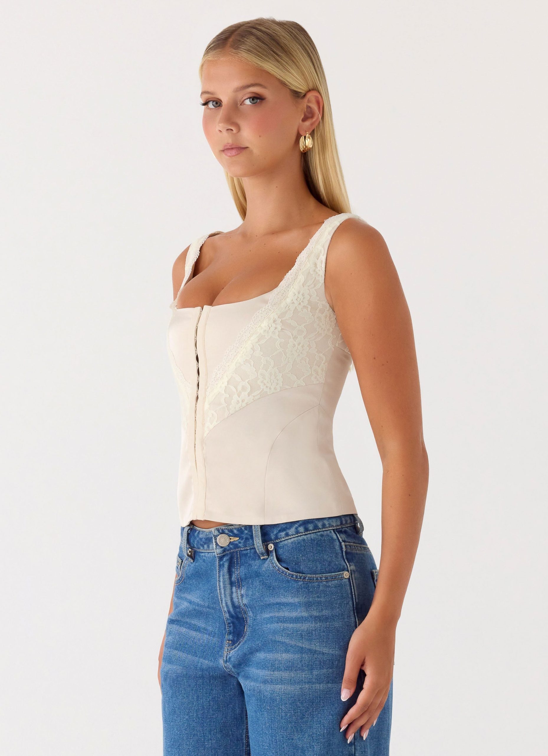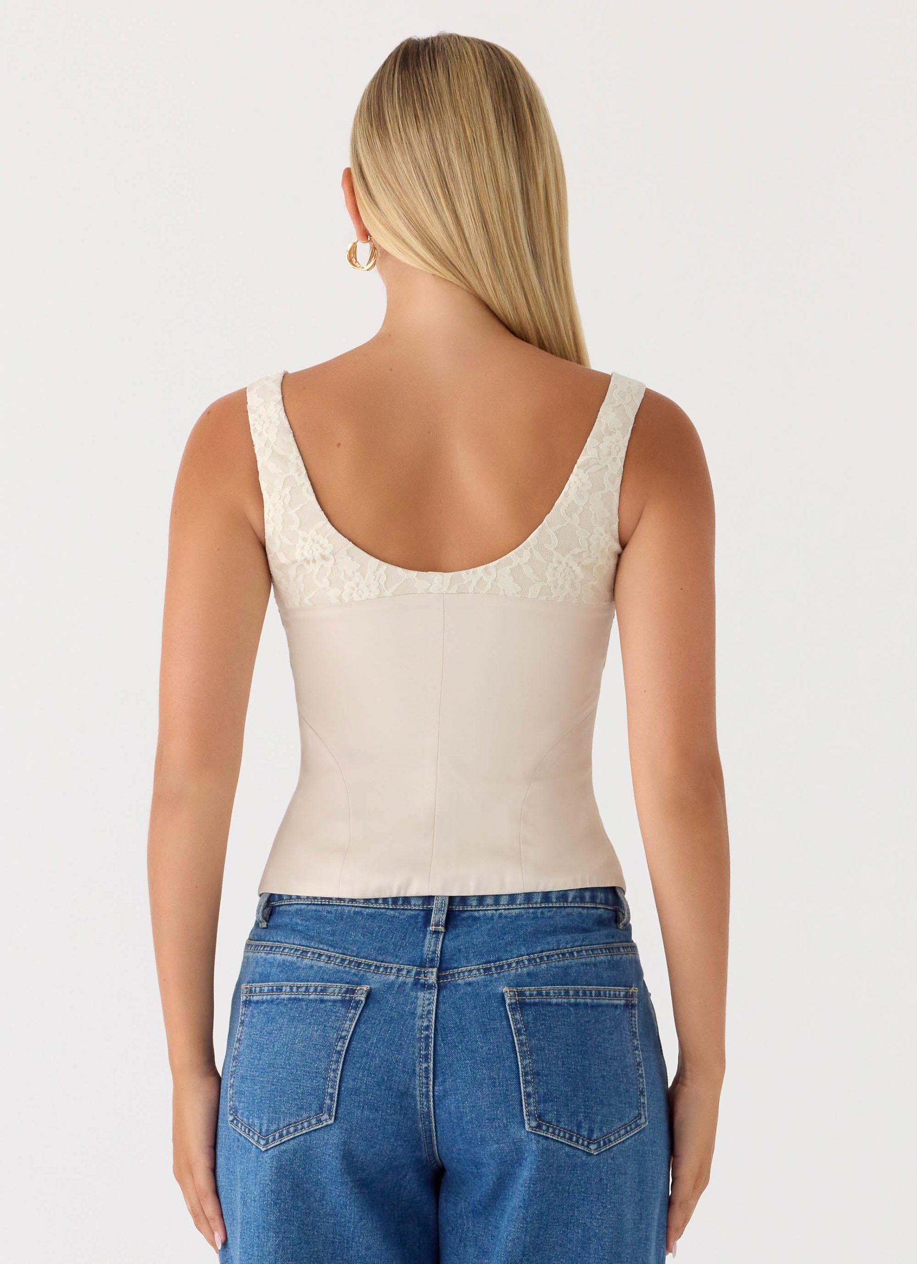 The Ailee Top is made for sunlit moments that carry effortlessly into golden evenings. Featuring a square neckline and delicate lace trim. this fitted silhouette is finished with a hook-and-eye front closure for subtle. feminine detailing. Fully lined for a smooth feel. it exudes confident. editorial elegance.