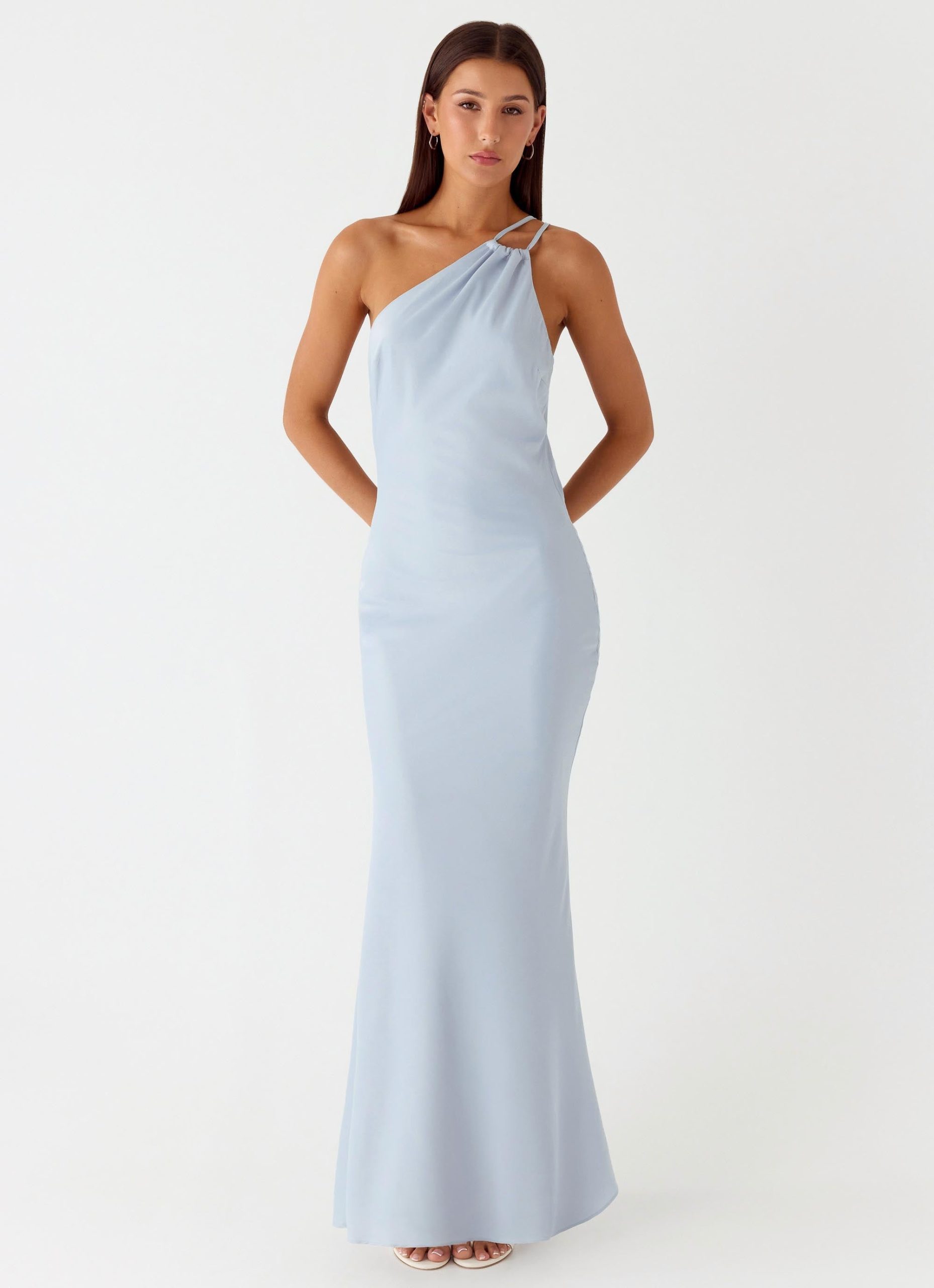 The All My Tomorrows Maxi Dress is a sleek. satin-finish maxi that combines elegance with modern edge. Featuring an asymmetrical neckline. body-hugging fit. and low back. this fully lined dress offers a sophisticated silhouette.