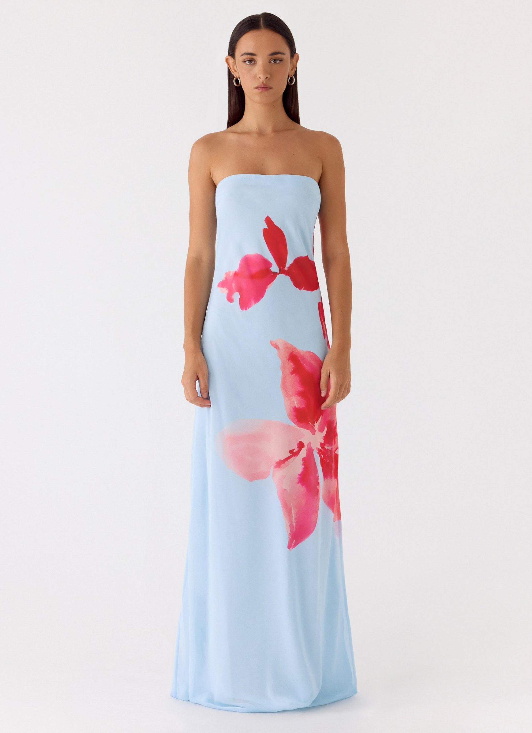 The Amelle Maxi Dress features a strapless neckline with silicone taping for a secure fit. this flowing maxi silhouette is crafted in lightweight chiffon and adorned with an exclusive print. Fully lined with a side hook-and-eye and invisible zipper. it’s a statement piece that moves with elegance and confidence.