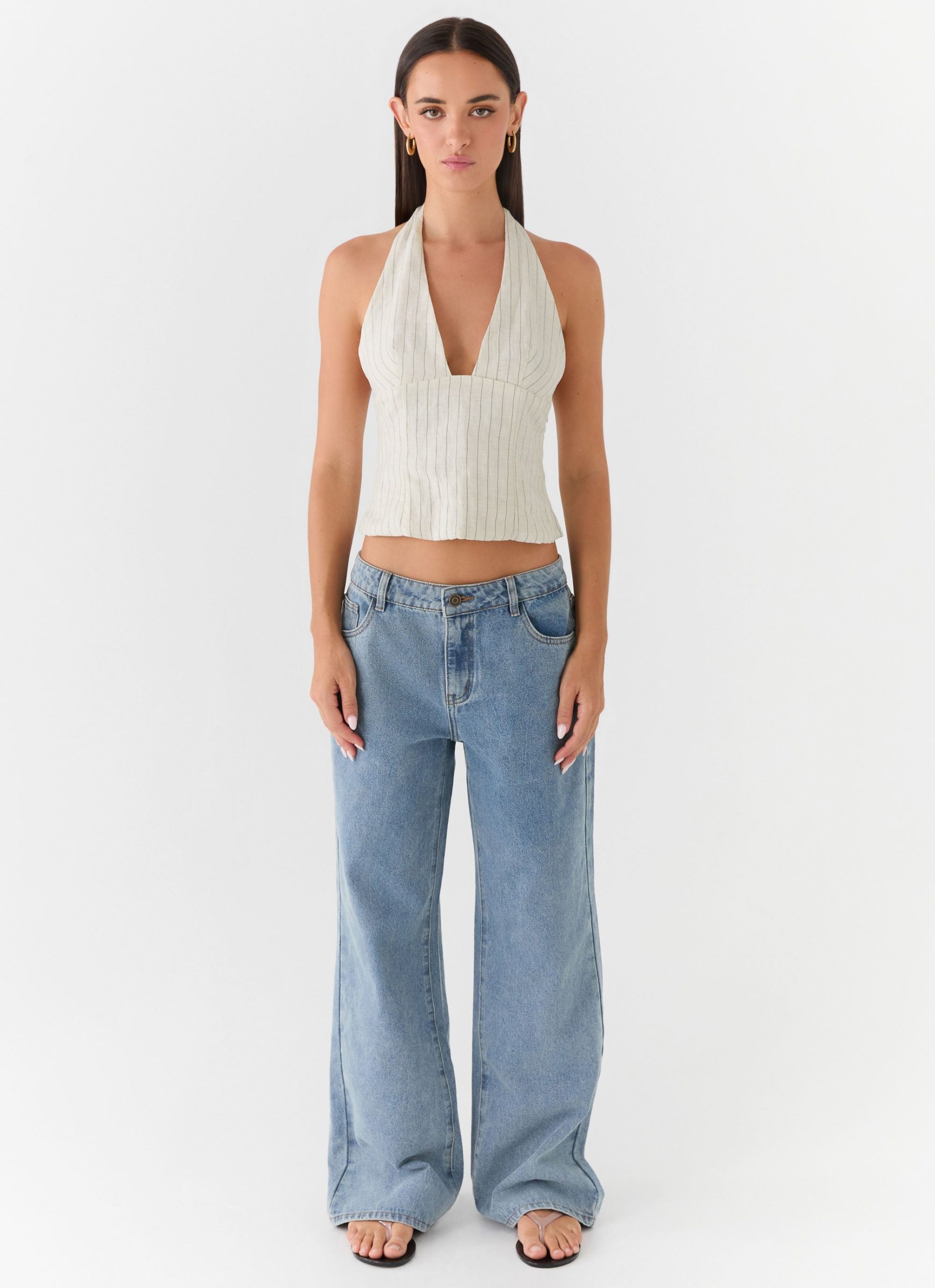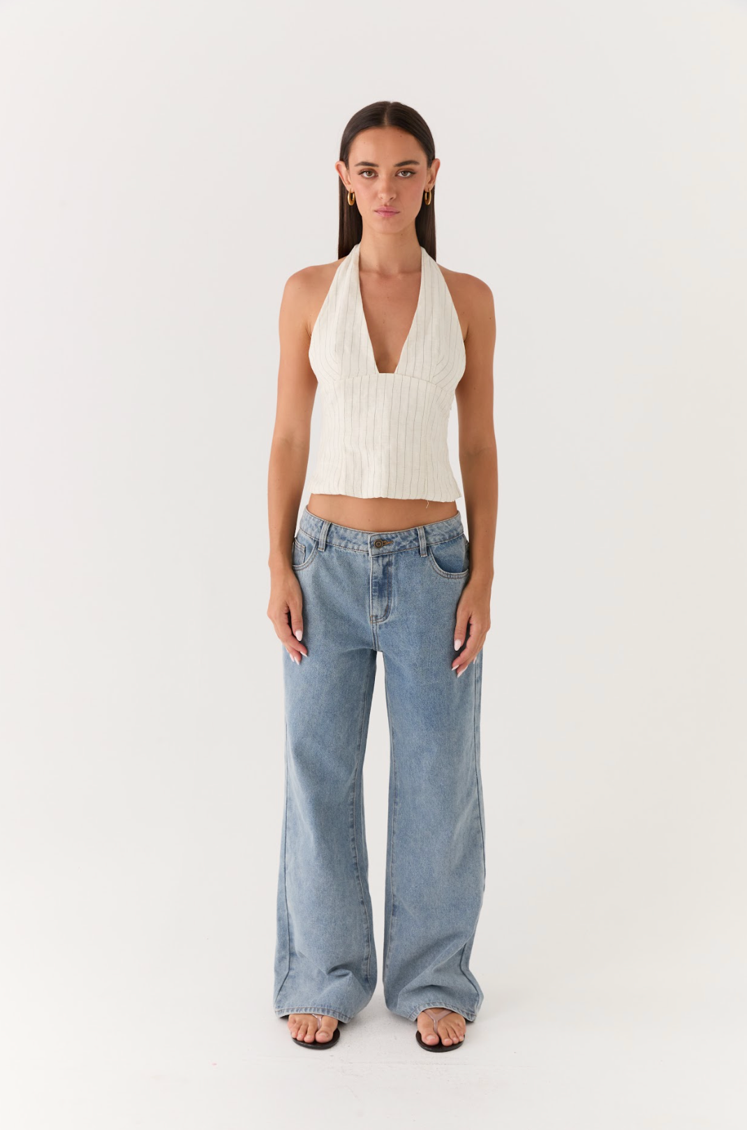 The Amiera Halter Top features a deep v – neckline. a bold striped pattern. and a striking halter neck silhouette. This fully lined piece is designed with a thick adjustable back strap and a side invisible zipper for a secure. tailored fit.
