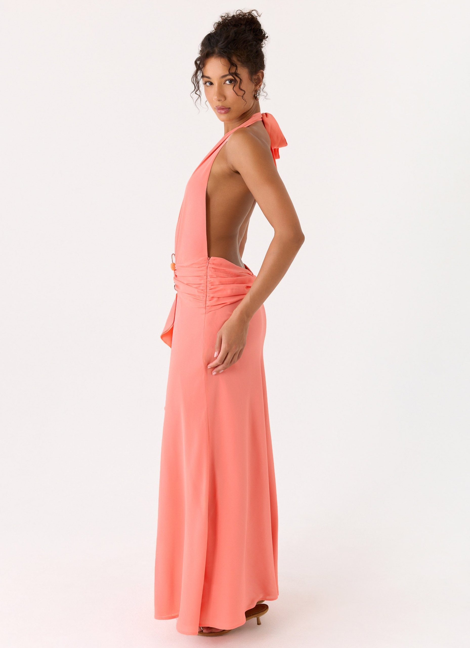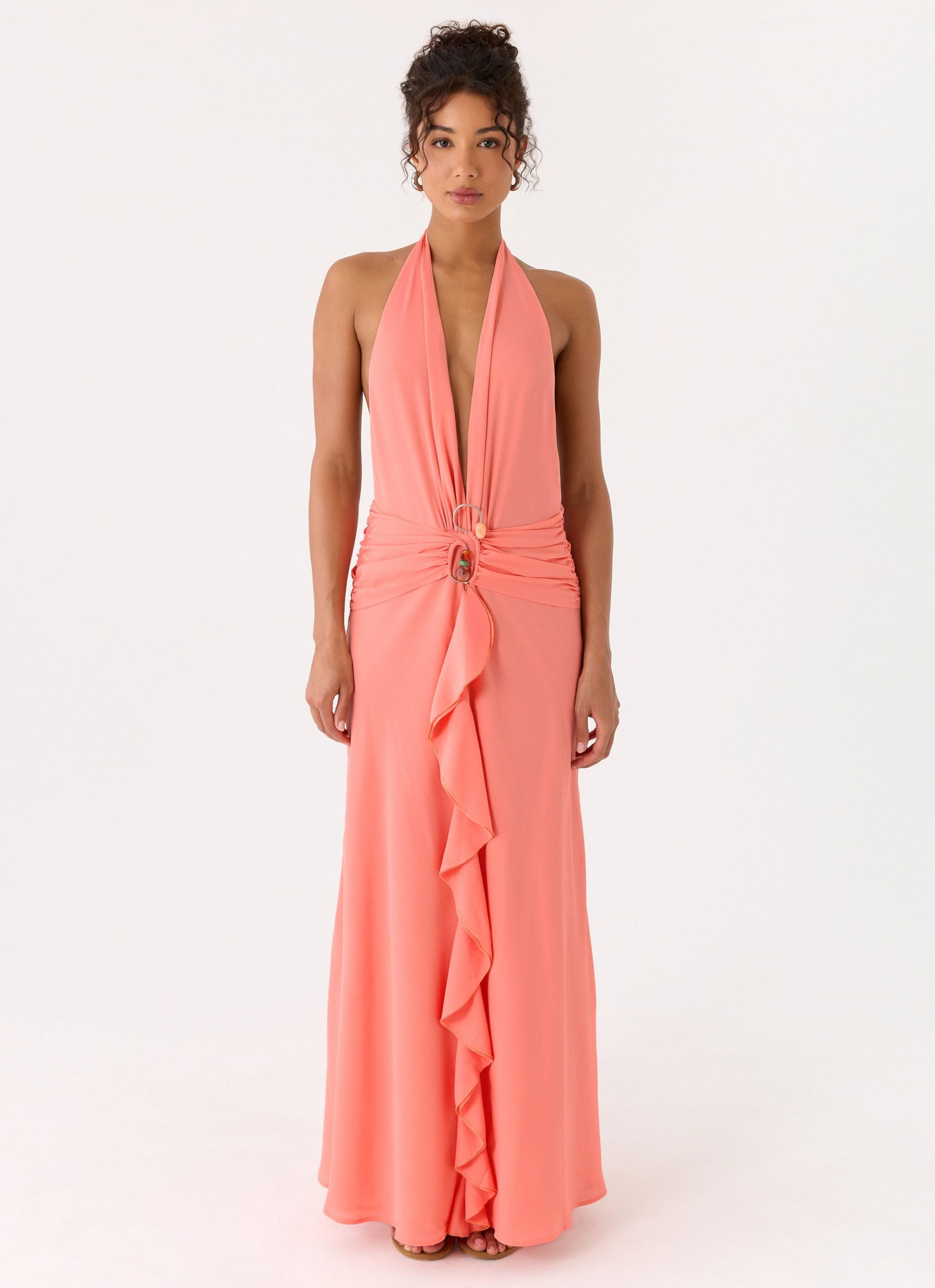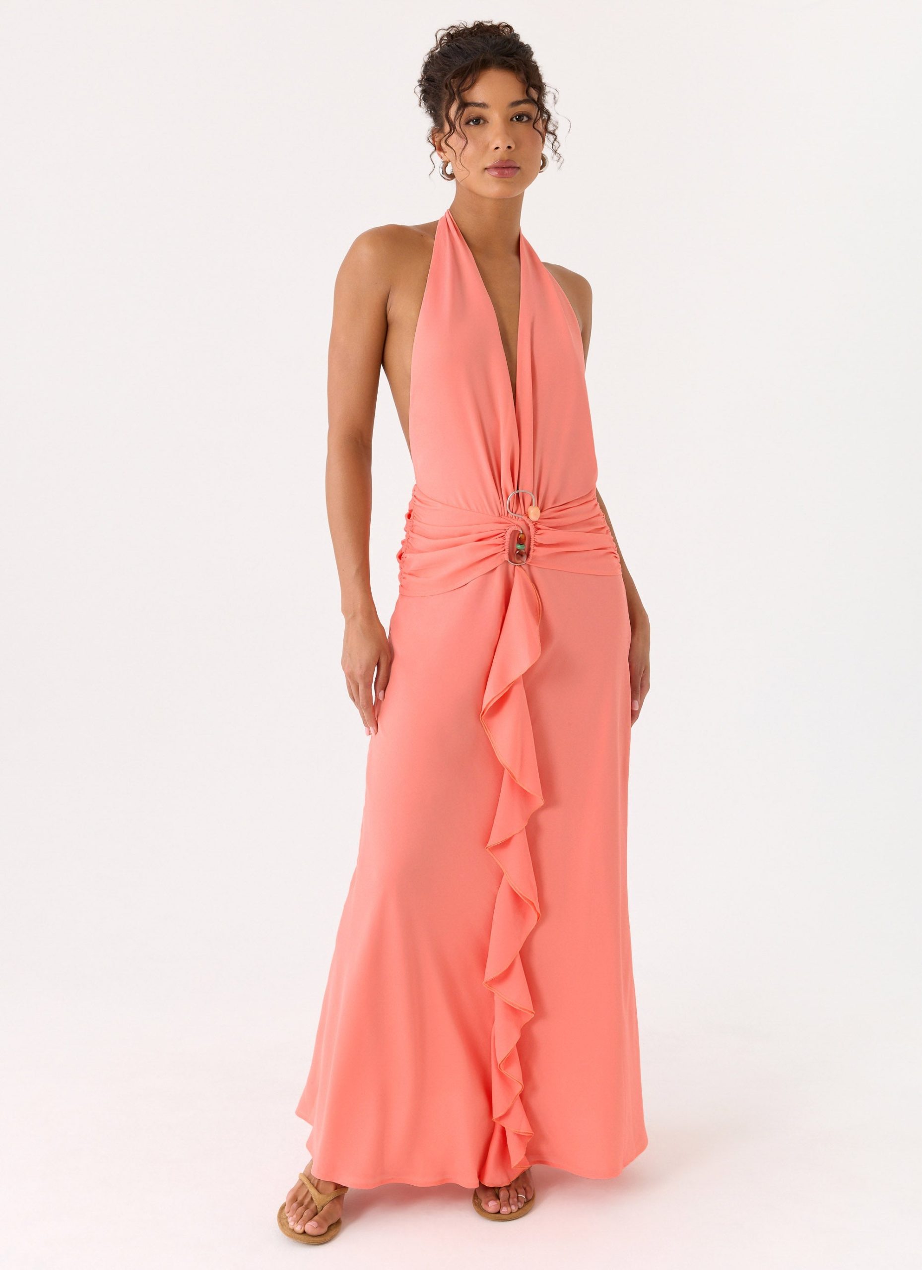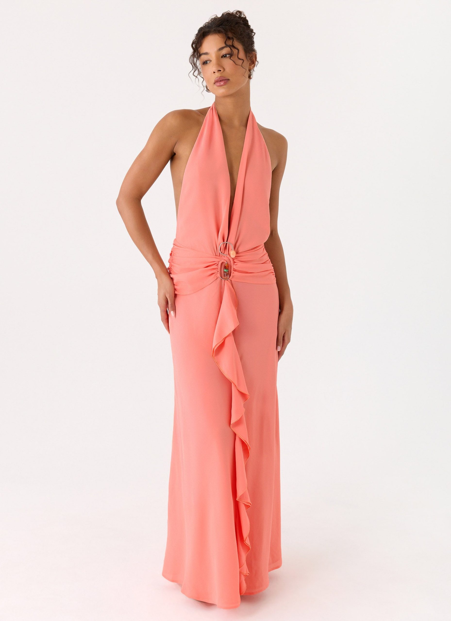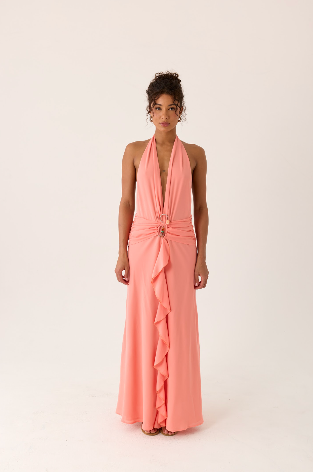 The Attina Halter Maxi Dress features a halter neckline with a thick adjustable strap. this flowing maxi silhouette is adorned with front beaded embellishments. ruffle trims. and a ruched waistline for flattering shape. Fully lined with a low back and side invisible zipper. it’s crafted in lightweight chiffon for effortless movement from sunset into after-dark moments.