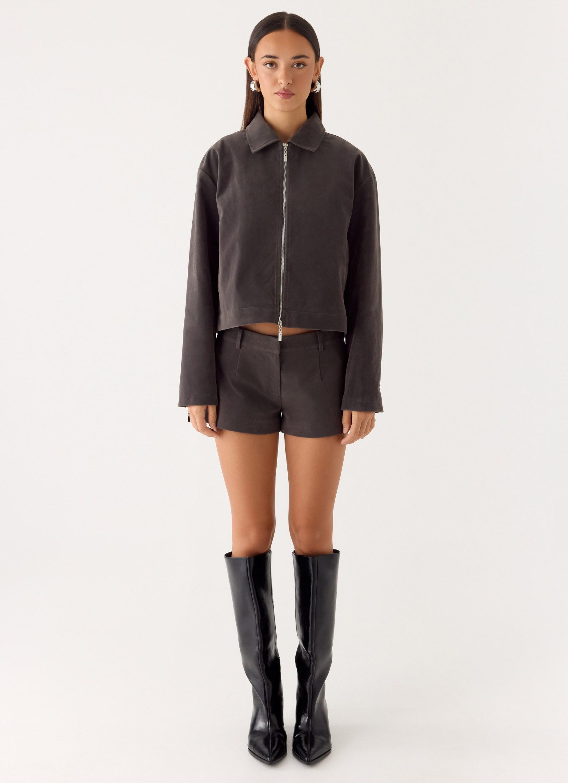 The Austina Faux Suede Boxy Jacket is made for chic layering with an effortless edge. Featuring a double collared neckline and relaxed boxy fit. this fully lined jacket combines style with functionality. Complete with a front metal zipper and side welt pockets. it’s perfect for elevating both day and night looks.