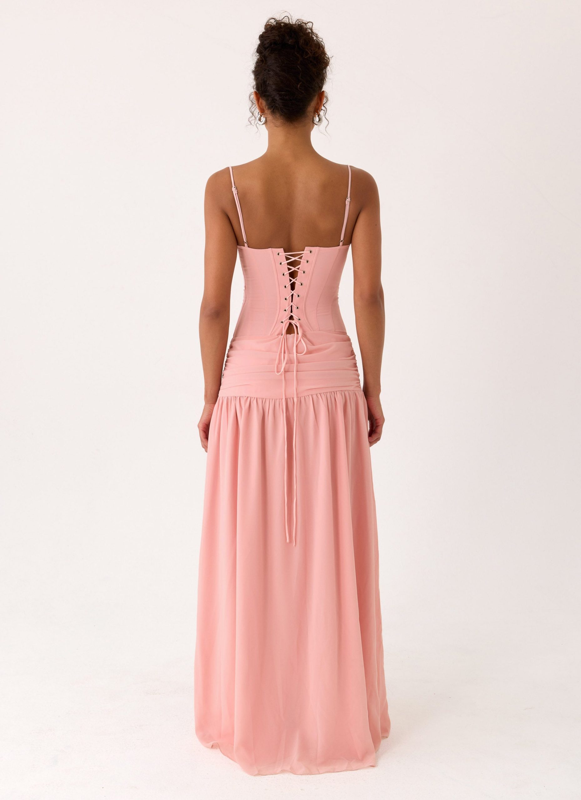 The Clemence Bustier Maxi Dress features a structured bustier bodice with built-in boning and adjustable straps. it sculpts a feminine silhouette that flows into a dramatic maxi length. Finished with a bold front slit and intricate lace-up back detailing. this fully lined dress is a statement piece designed for sunset to after-dark escapades.