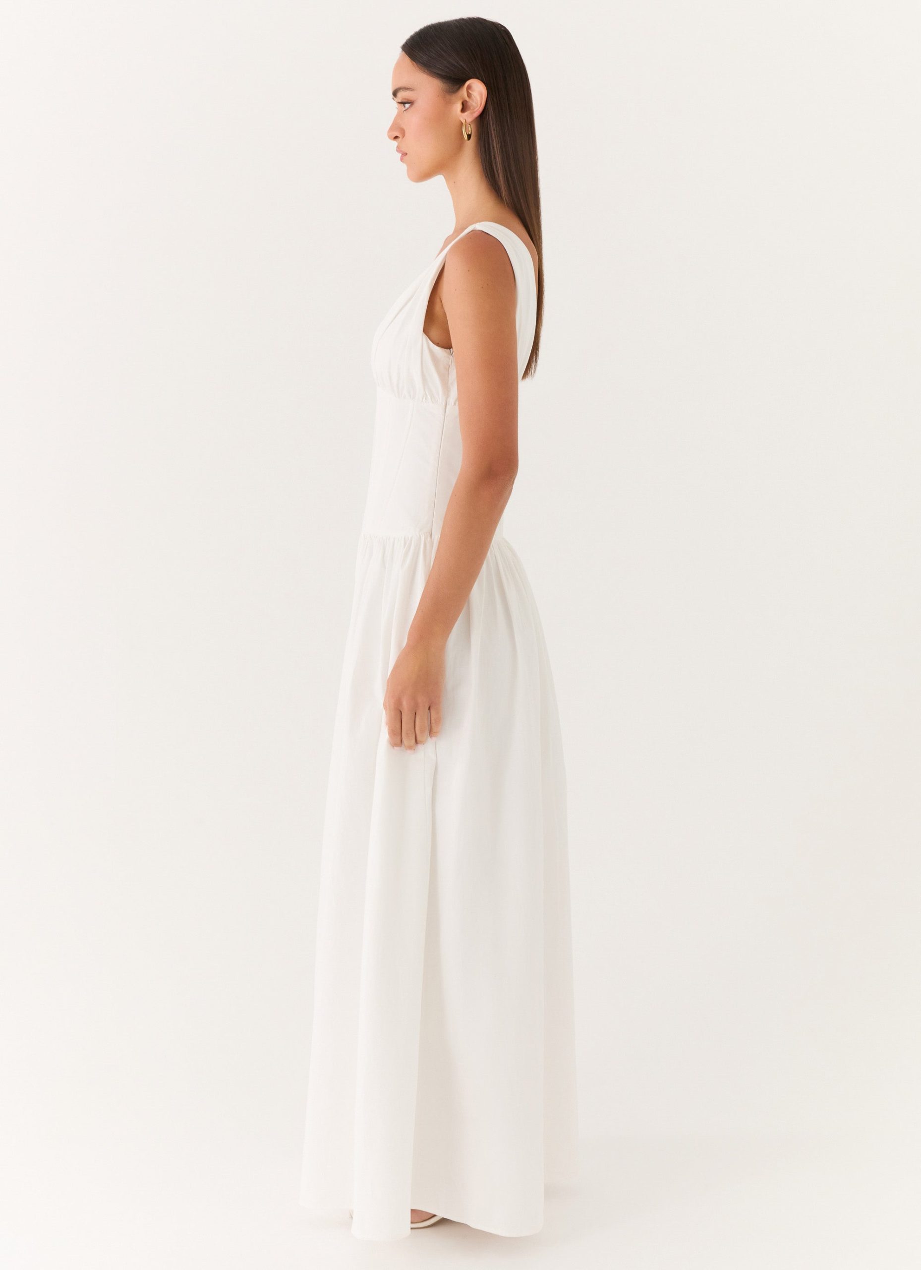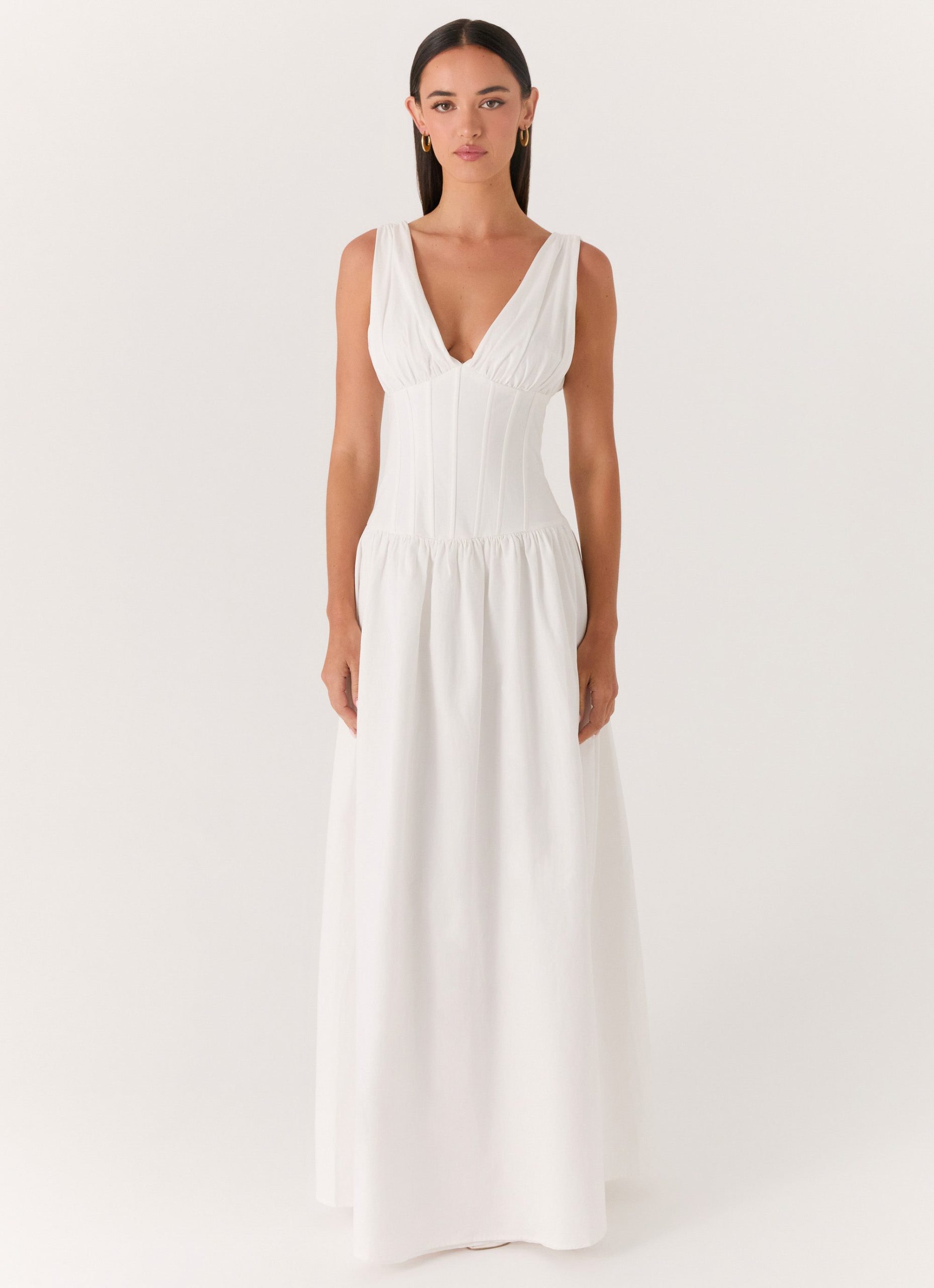 The Eunbi Maxi Dress features a structured v – neckline. specialised boning at the waist. and a dramatic drop waist skirt. This tight – fitting silhouette flows into a wide floaty hem. creating a sophisticated maxi length.