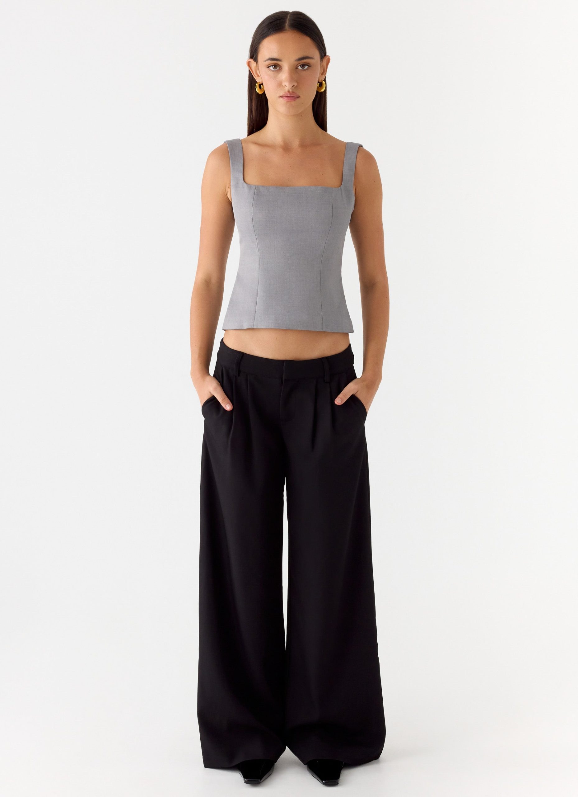 The False Start Top is made for confident nights and elevated essentials. Designed with a fitted silhouette and thick straps. this structured suiting style contours the body with a clean. sculpted finish.