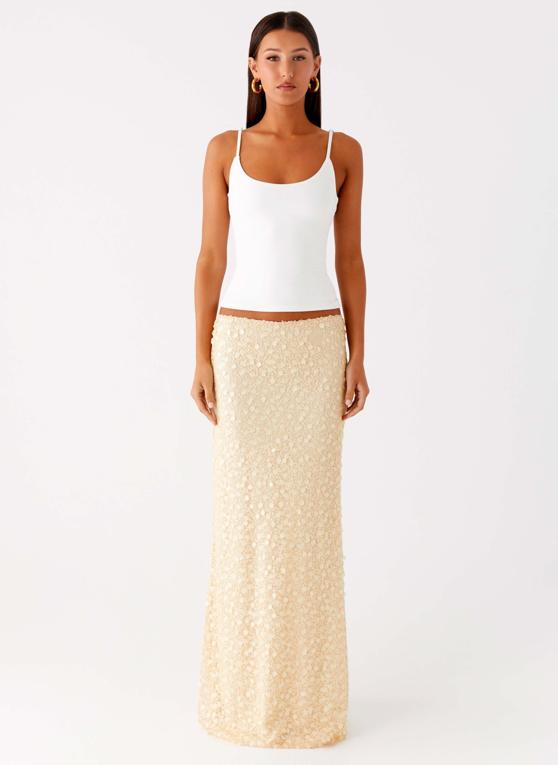 The Honestly Sequin Maxi Skirt glimmers with every step from golden hour through nightfall. Featuring a low rise silhouette and stretch sequins material. this maxi skirt combines effortless glamour with comfortable fit thanks to its elasticated waistband. Fully lined for smooth wear. it’s your statement piece for cocktail parties and beyond.