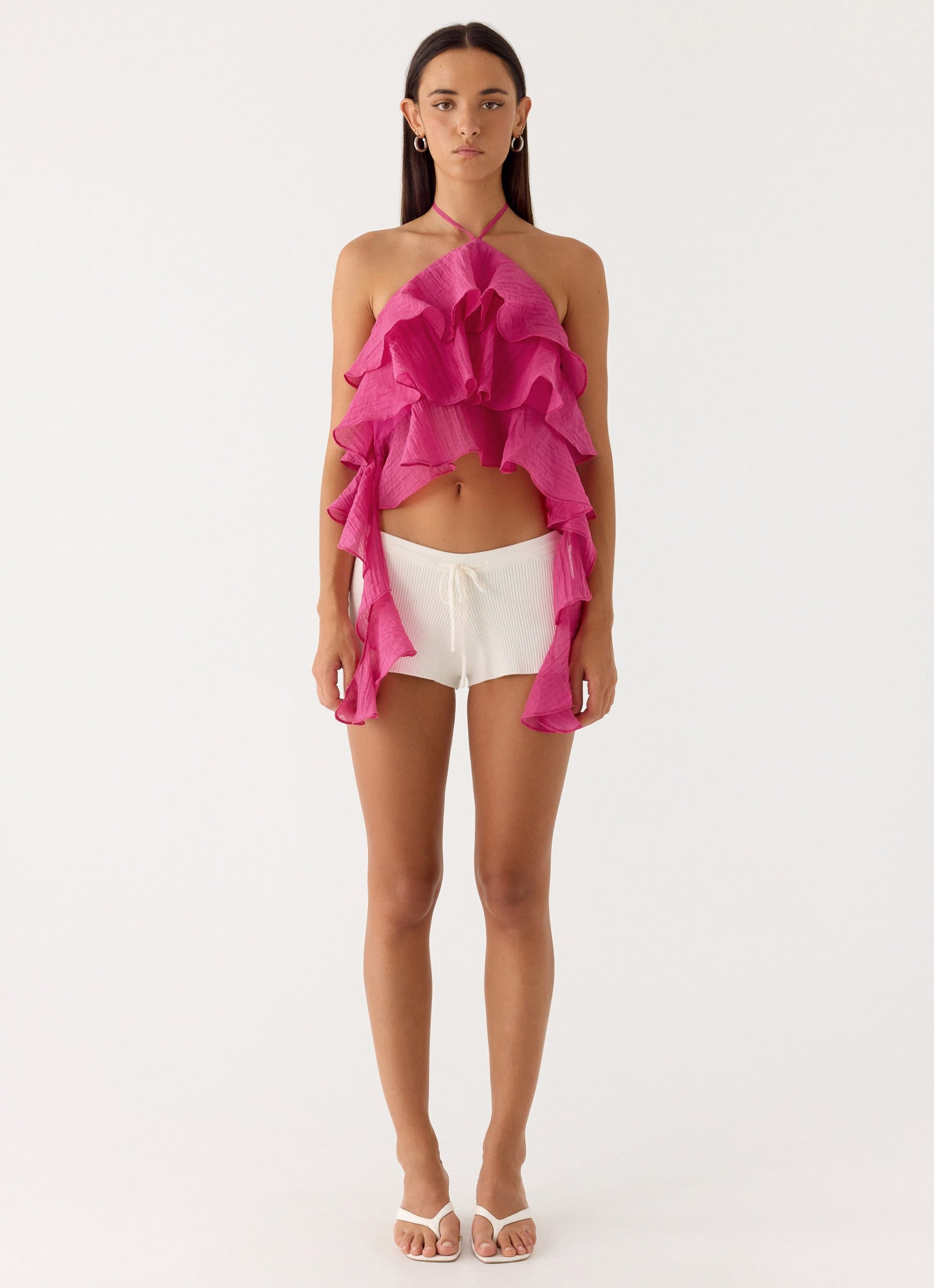 The Inna Frill Halter Top is a playful and flirty addition to your wardrobe. Featuring tiered ruffles and a low back for a chic. summery look.