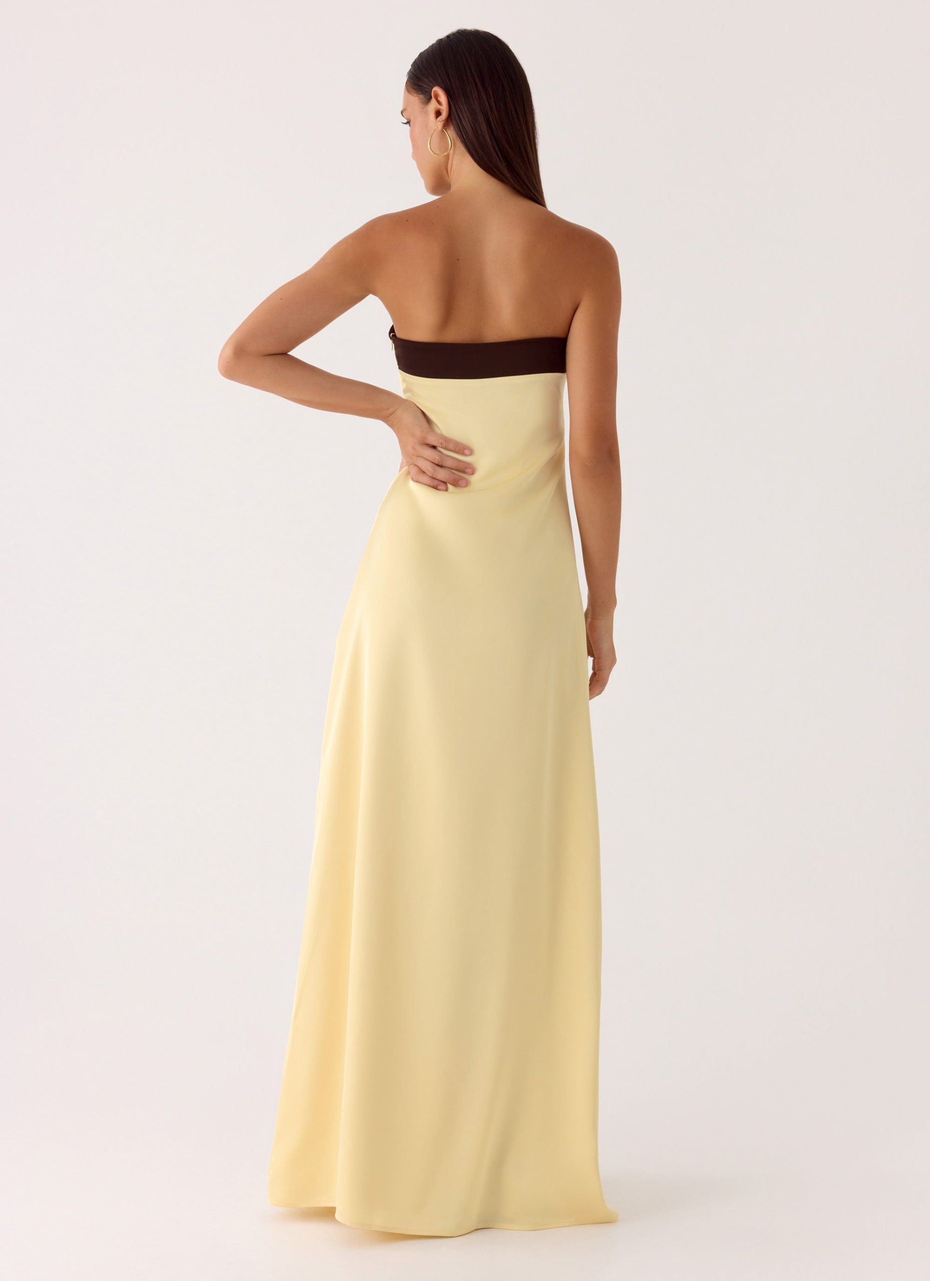 The Jiana Maxi Dress is made for nights that shimmer in candlelight and golden hour skies. Falling in a sweeping maxi length. its strapless neckline and satin finish create a sculpted. elegant silhouette. With an invisible side zipper. it offers effortless wear while capturing a refined. after-dark allure.
