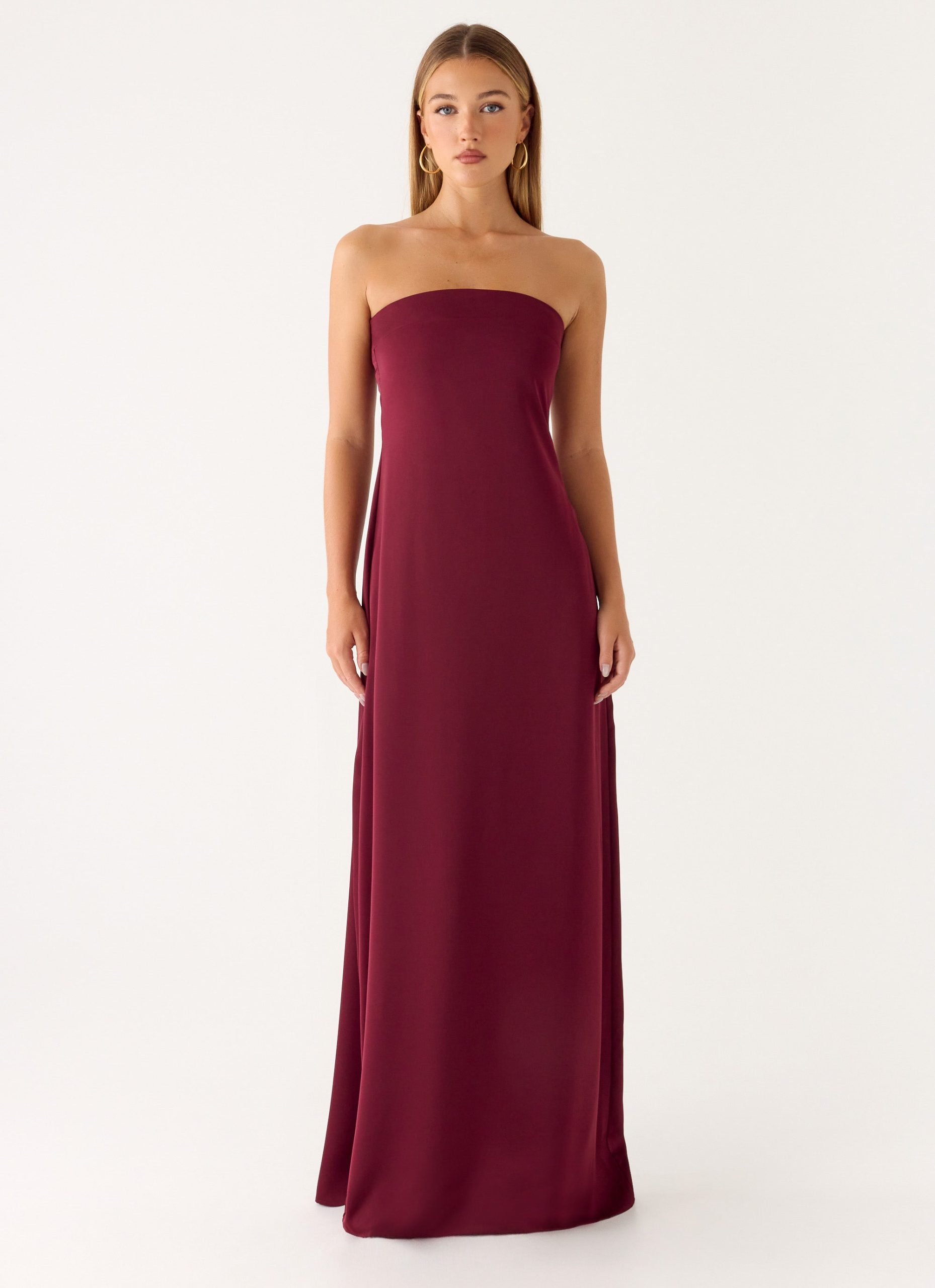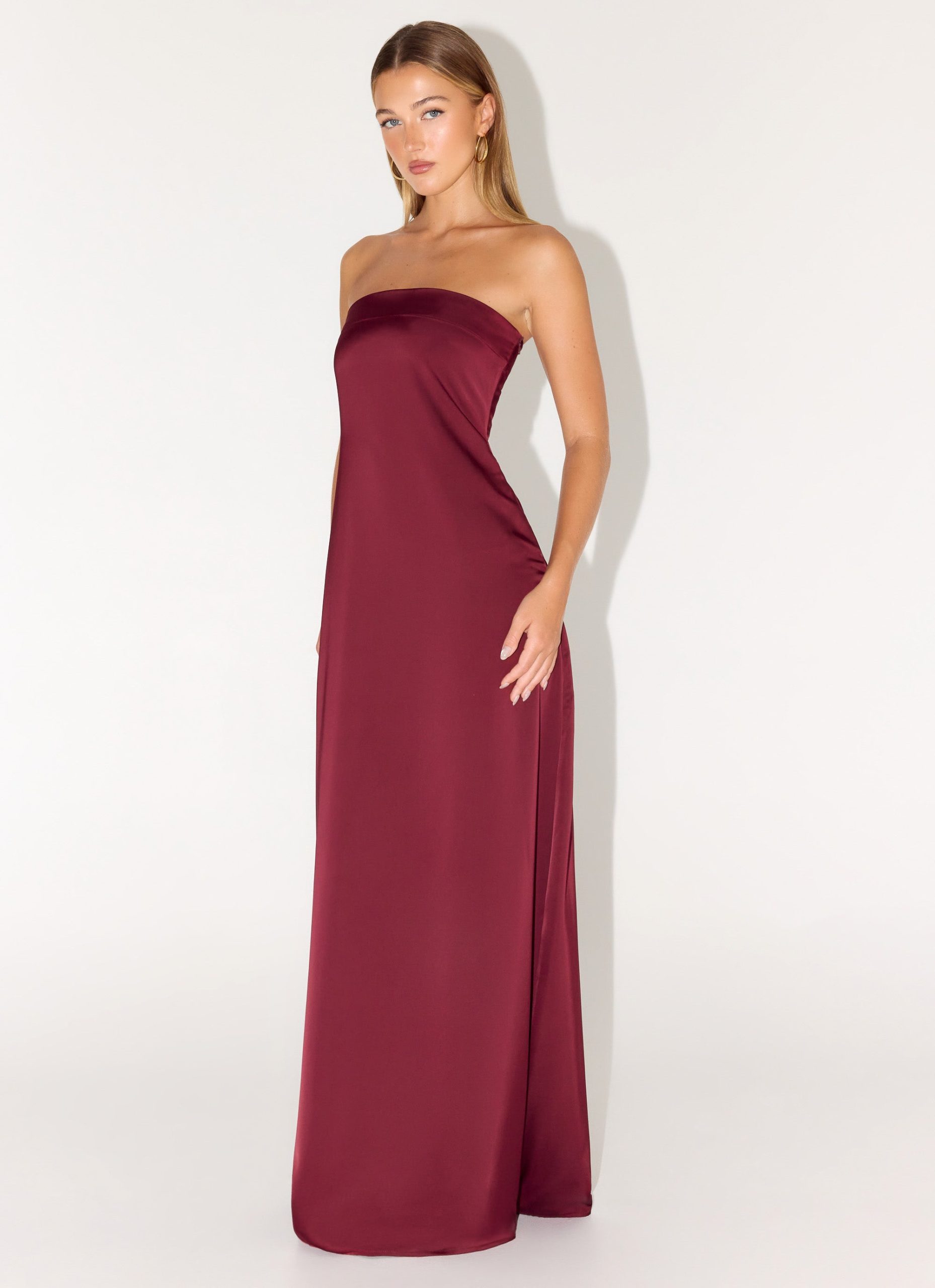 The Jiana Maxi Dress is an effortlessly elegant strapless silhouette made to flow with every movement. Its sleek. fitted shape and invisible side zipper create a polished finish. while luxe satin adds a subtle sheen perfect for golden-hour to evening occasions.