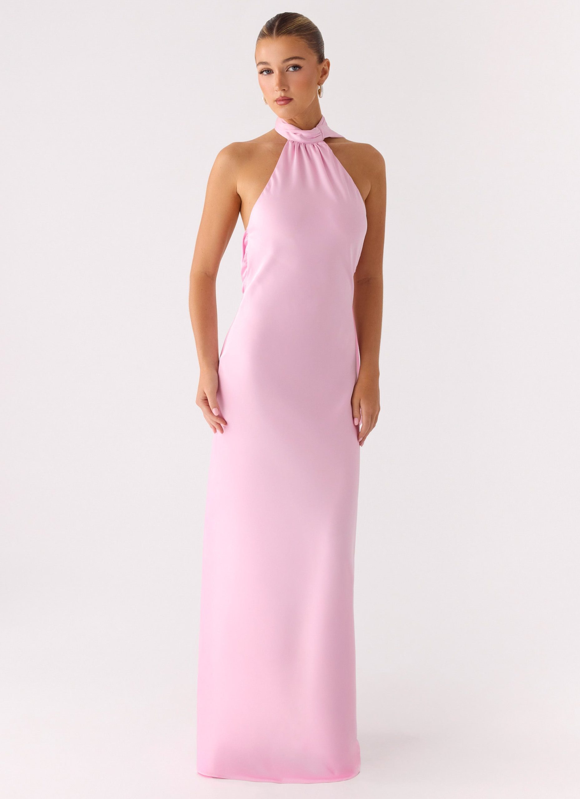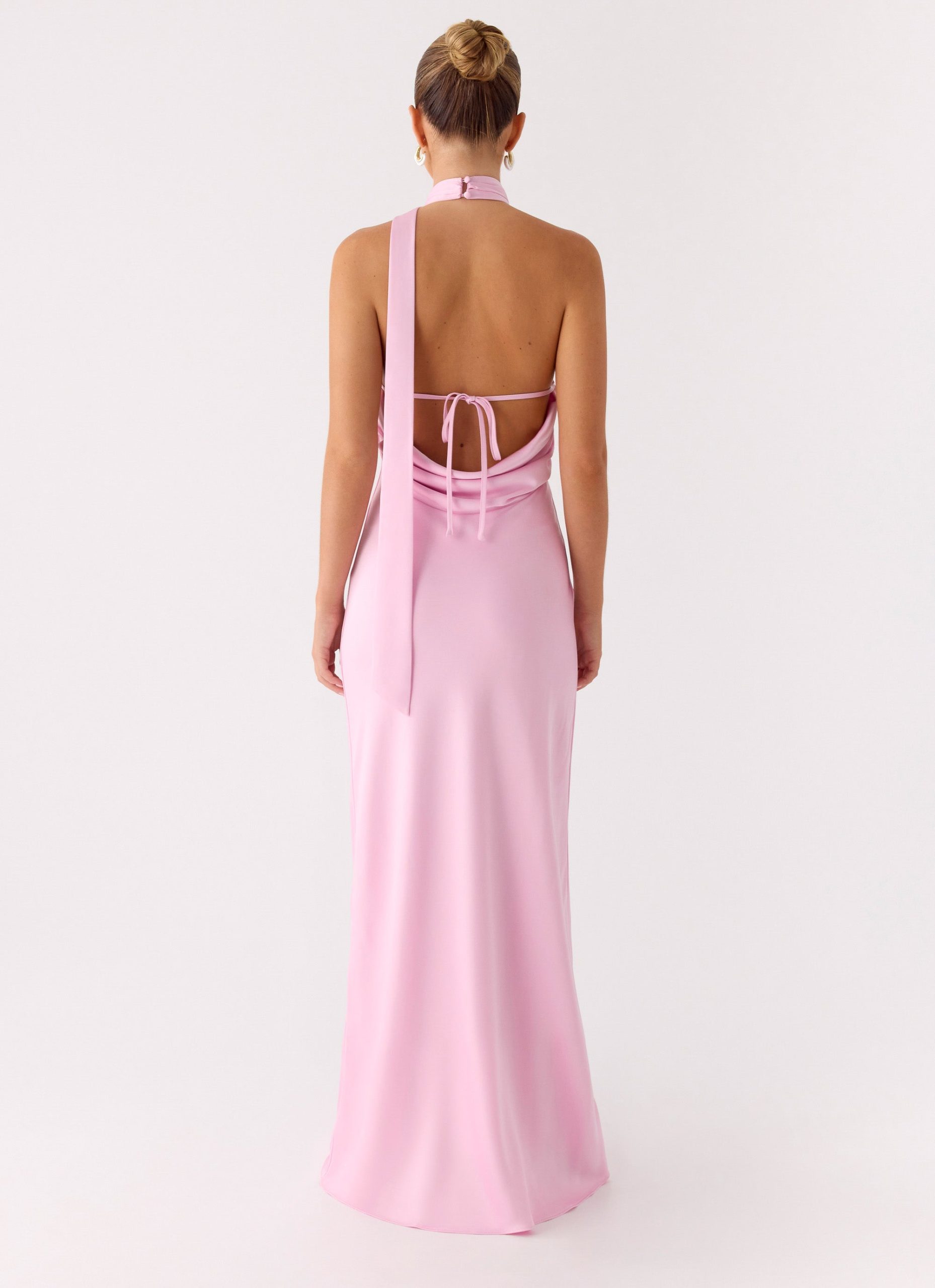 The Keena Scarf Maxi Dress is made for effortless elegance. Featuring a sophisticated halter neckline with long. thin straps and a sultry low cowl back. this bias-cut maxi drapes beautifully into a fluid silhouette. Crafted from a luxurious satin fabric.