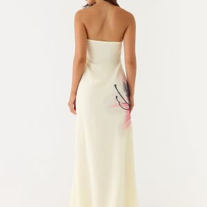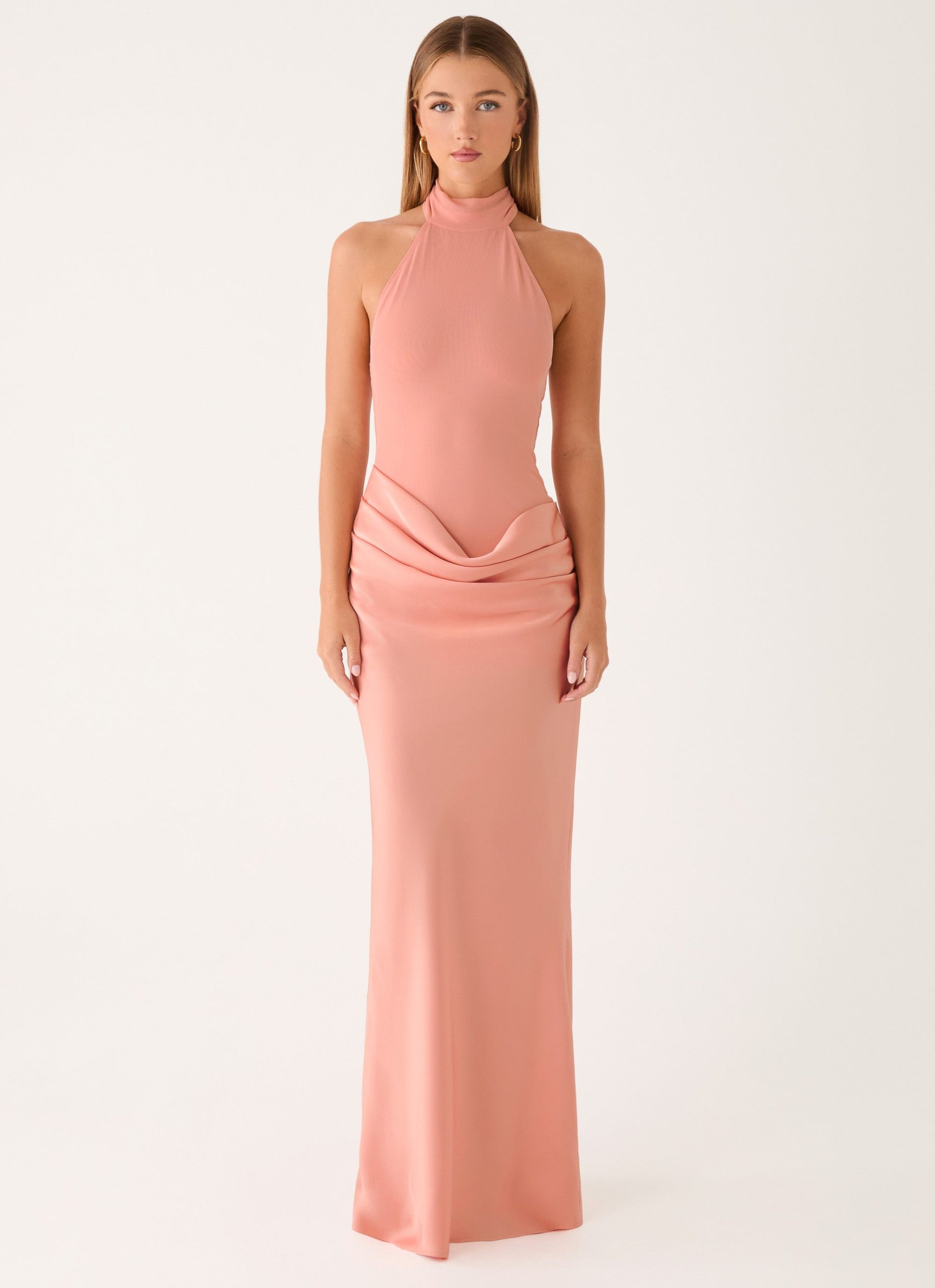 The Kiyah Maxi Dress is a striking blend of structure and fluidity. designed with a sleek high neckline and an elegant floor-length silhouette. The premium stretch mesh bodice contours the body. flowing into a softly draped satin skirt for a refined. elevated finish. With a low back detail. this piece is made for moments that call for effortless sophistication.