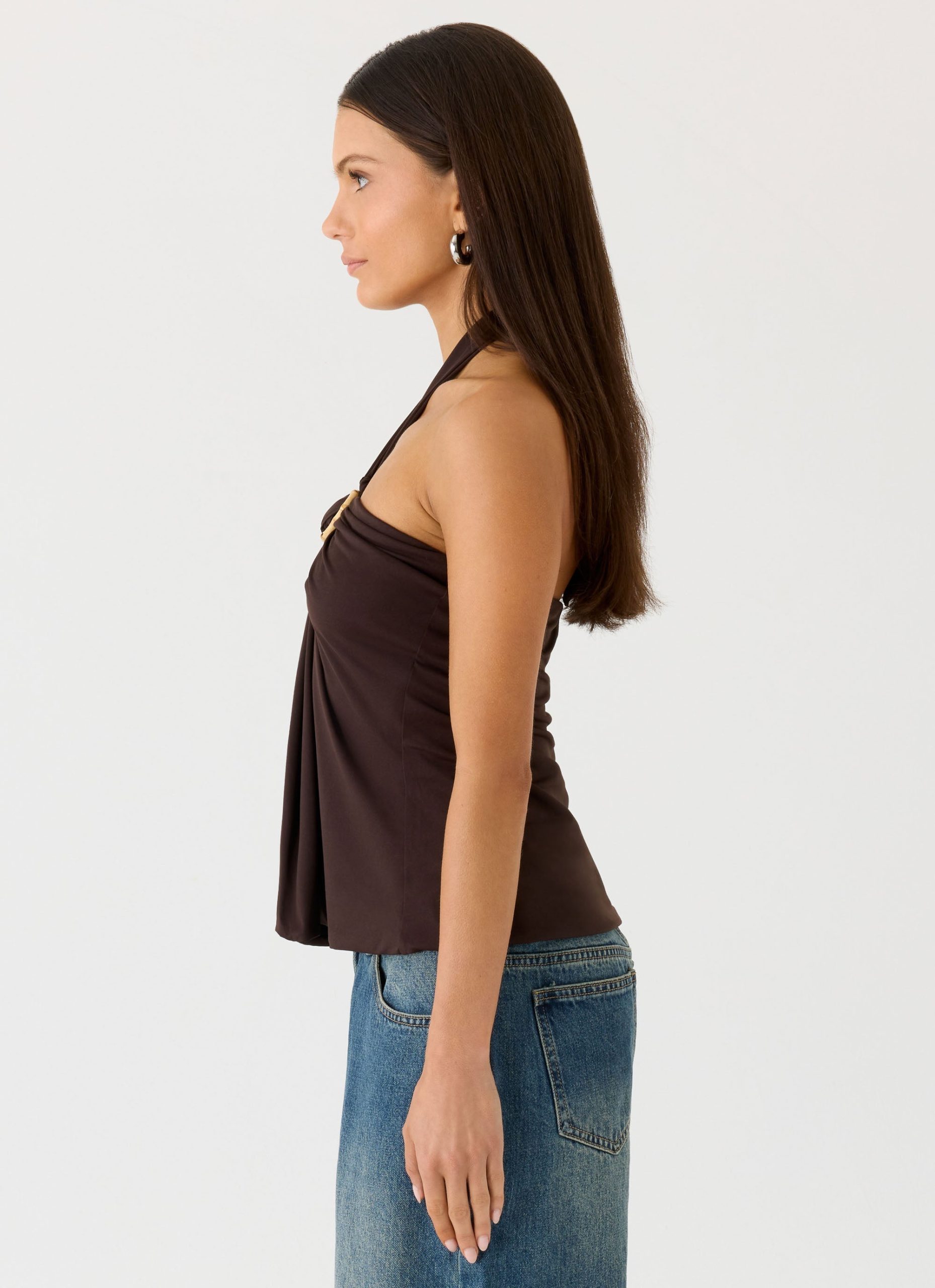 The Lorenza Halter Top is designed for breezy afternoons that linger into balmy nights. Featuring a ruched bust with wooden hardware detail and a halter neckline. this loose-fitting silhouette flows effortlessly over the body. Crafted for comfort and movement. it captures a relaxed yet elevated summer vibe.