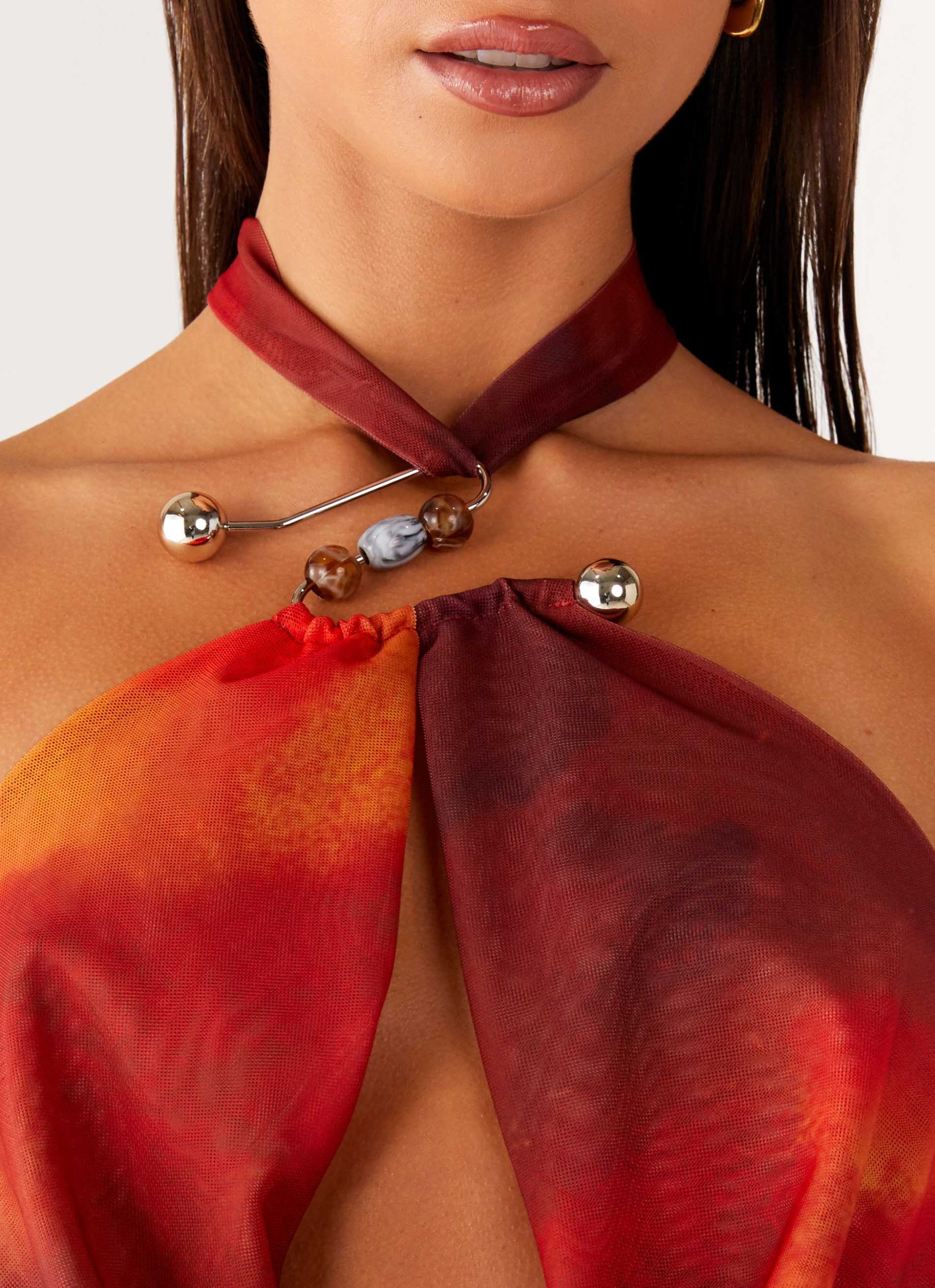 The Midnight Ember Mini Dress is made for unforgettable nights under golden skies. Featuring a halter neckline with low front cowl and cut-out detail. this fully lined mini is finished with ruched sides. a thick neck tie strap. and a front metal embellishment.