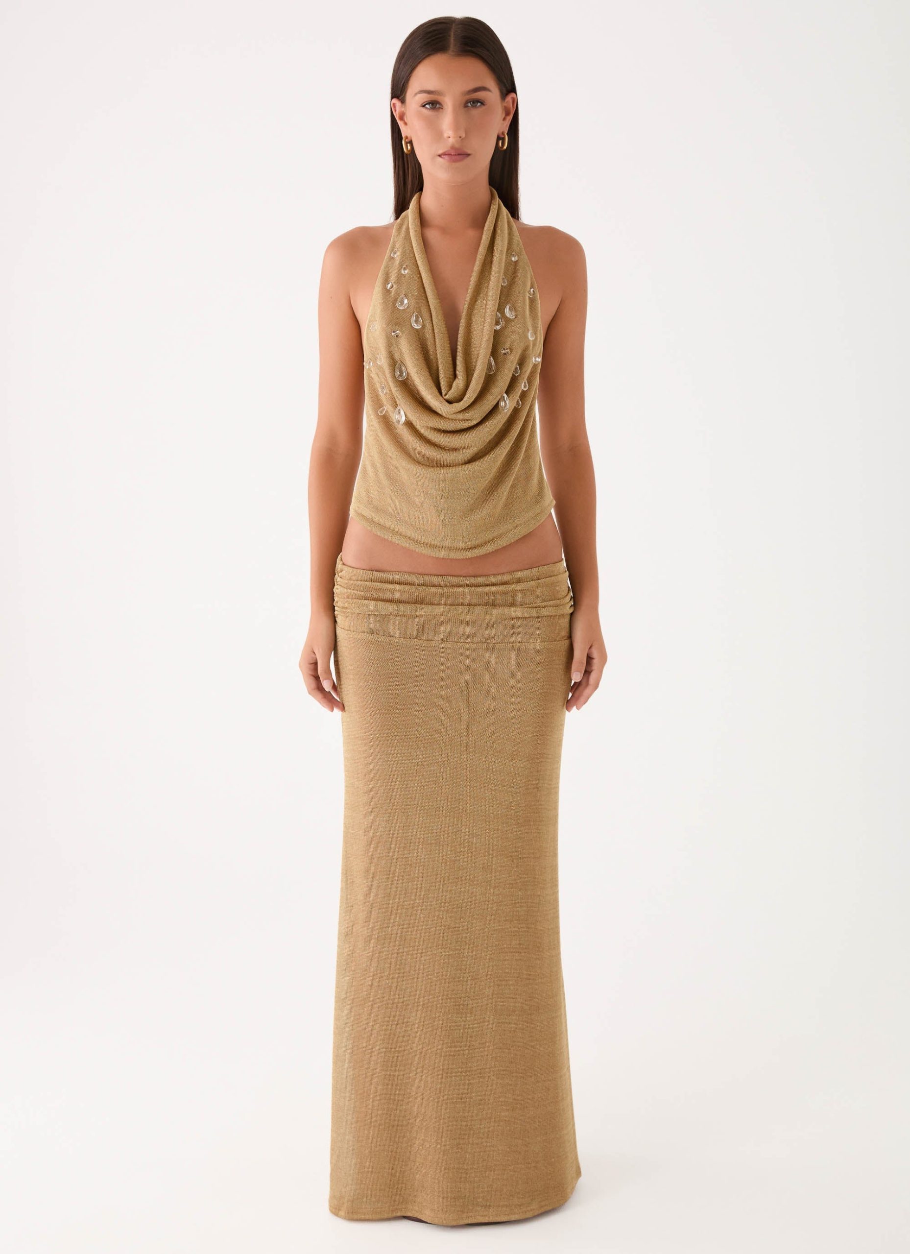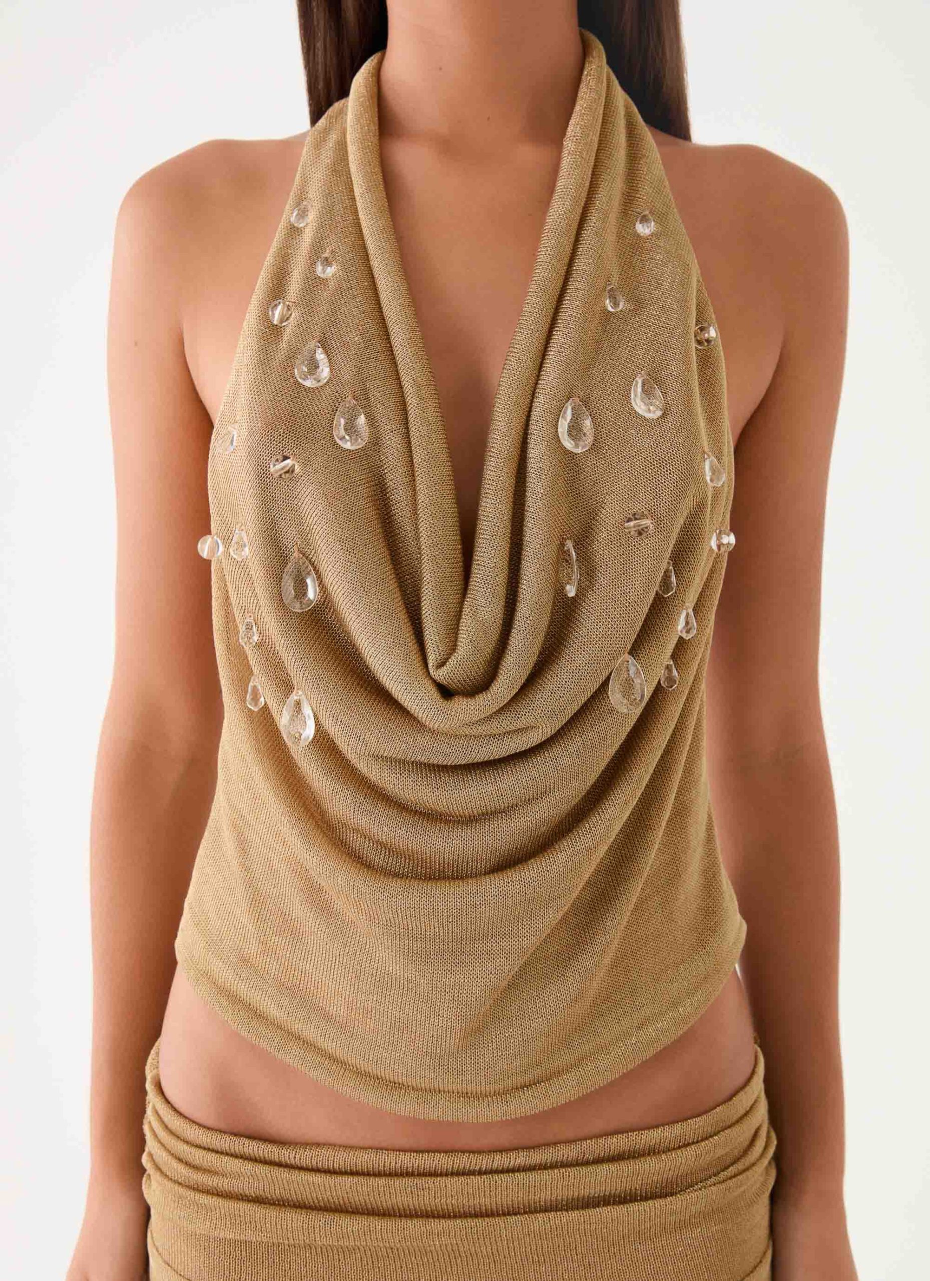 The Olyssia Shimmer Embellished Top features a shimmer knit fabrication and a sophisticated low cowl neckline. Detailed with delicate water droplet beaded embellishments and sleek halter straps. this stretchy. fully lined silhouette is designed to catch the light at every turn.