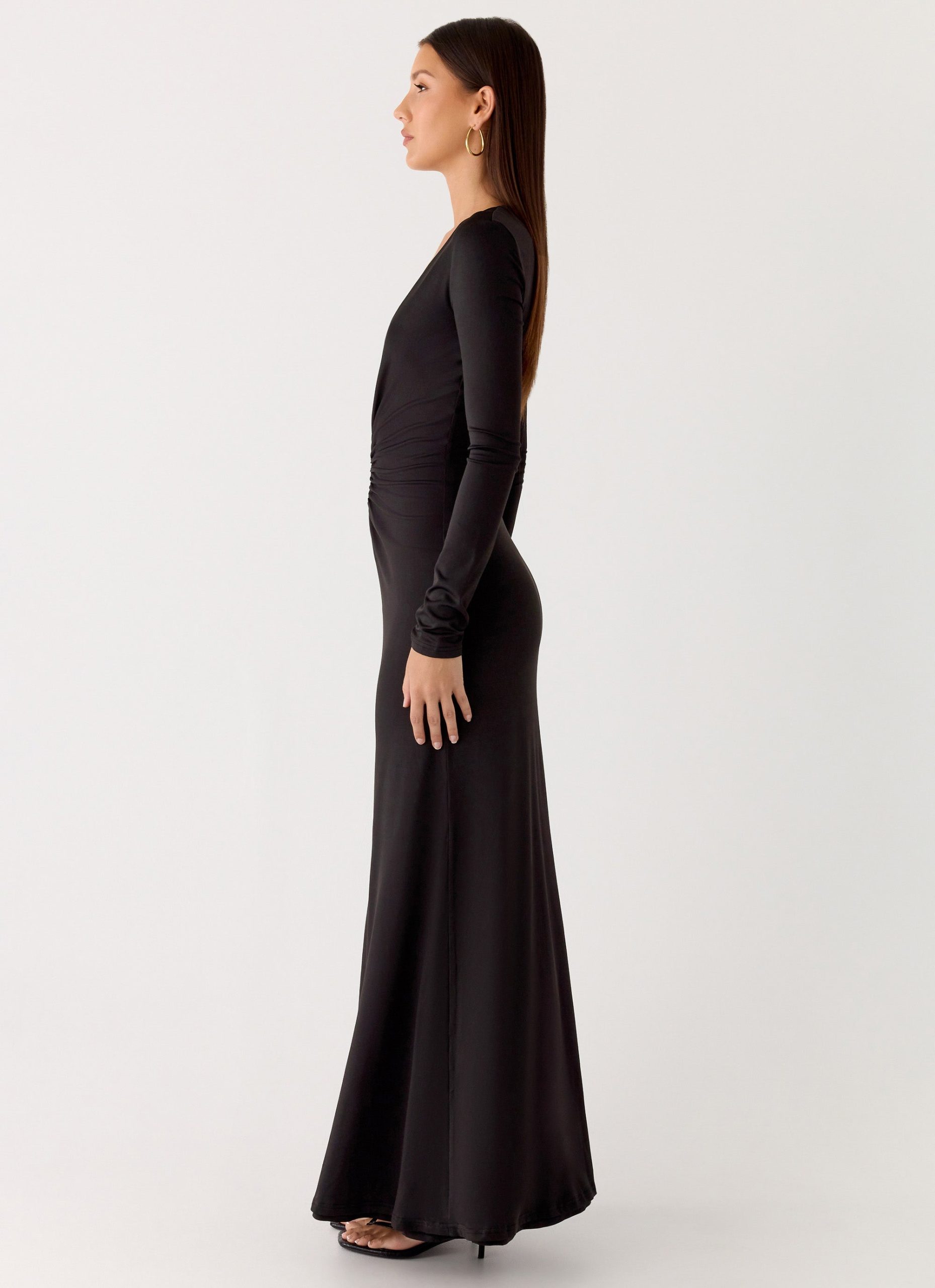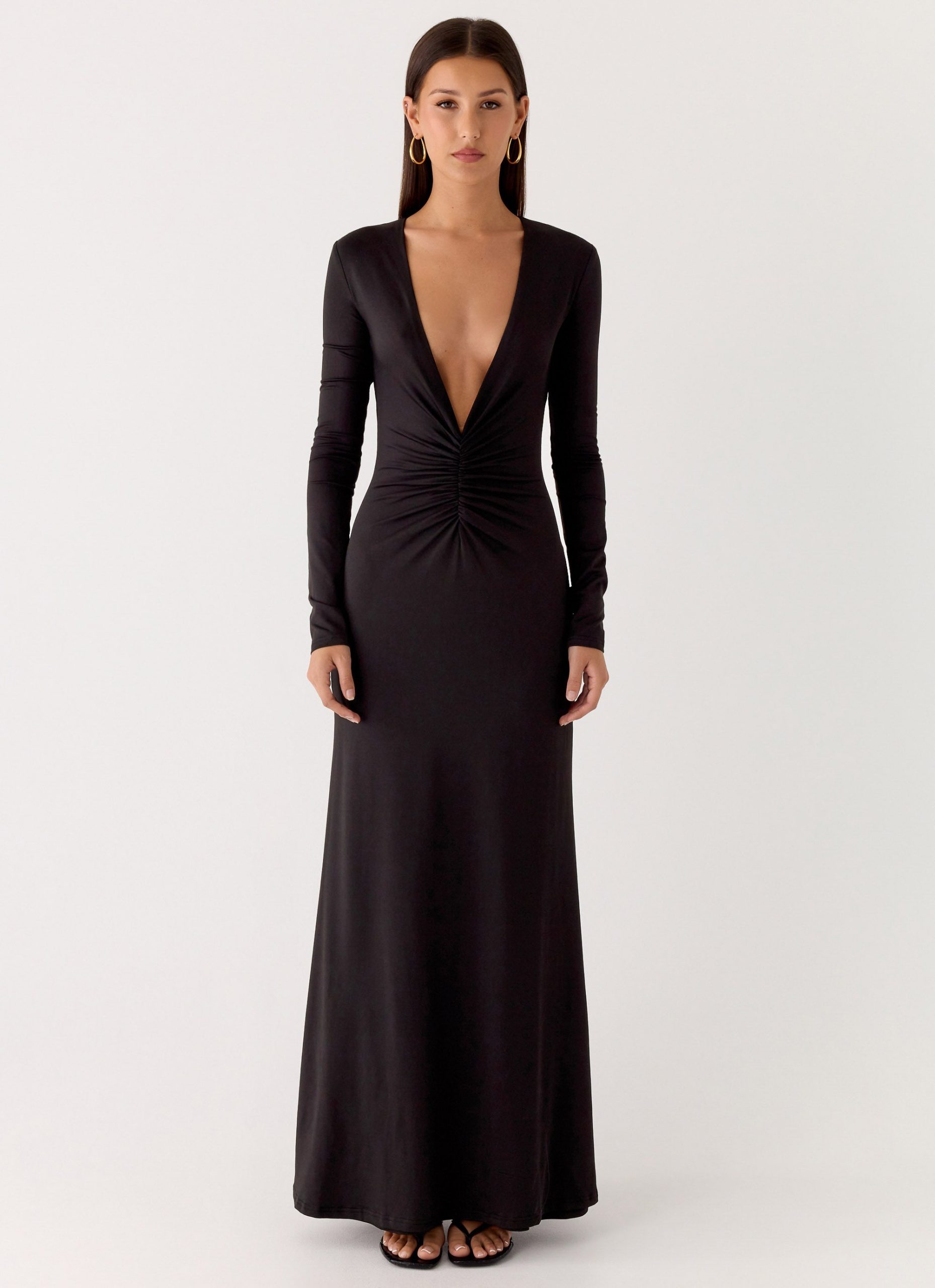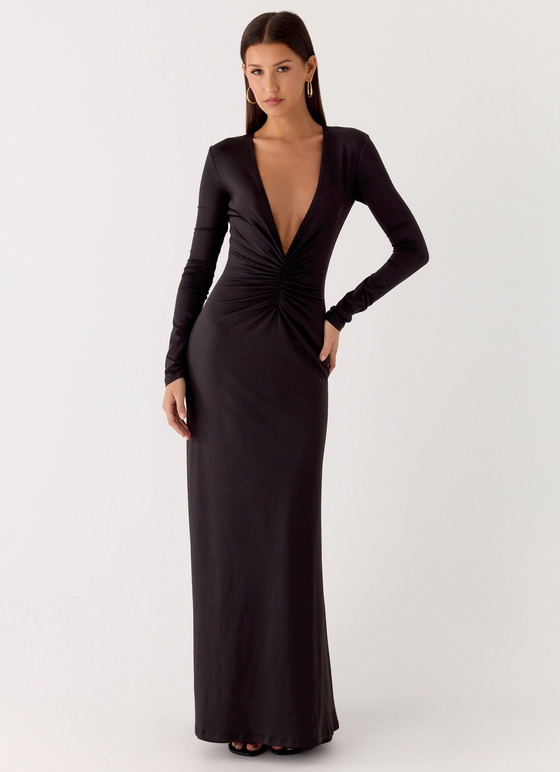 The Palm Haze Maxi Dress is made for golden hour moments and evening escapes. Featuring a deep V neckline and body ruching. this stretch jersey maxi dress creates a flattering. figure-hugging silhouette that moves effortlessly from beachside drinks to city nights.