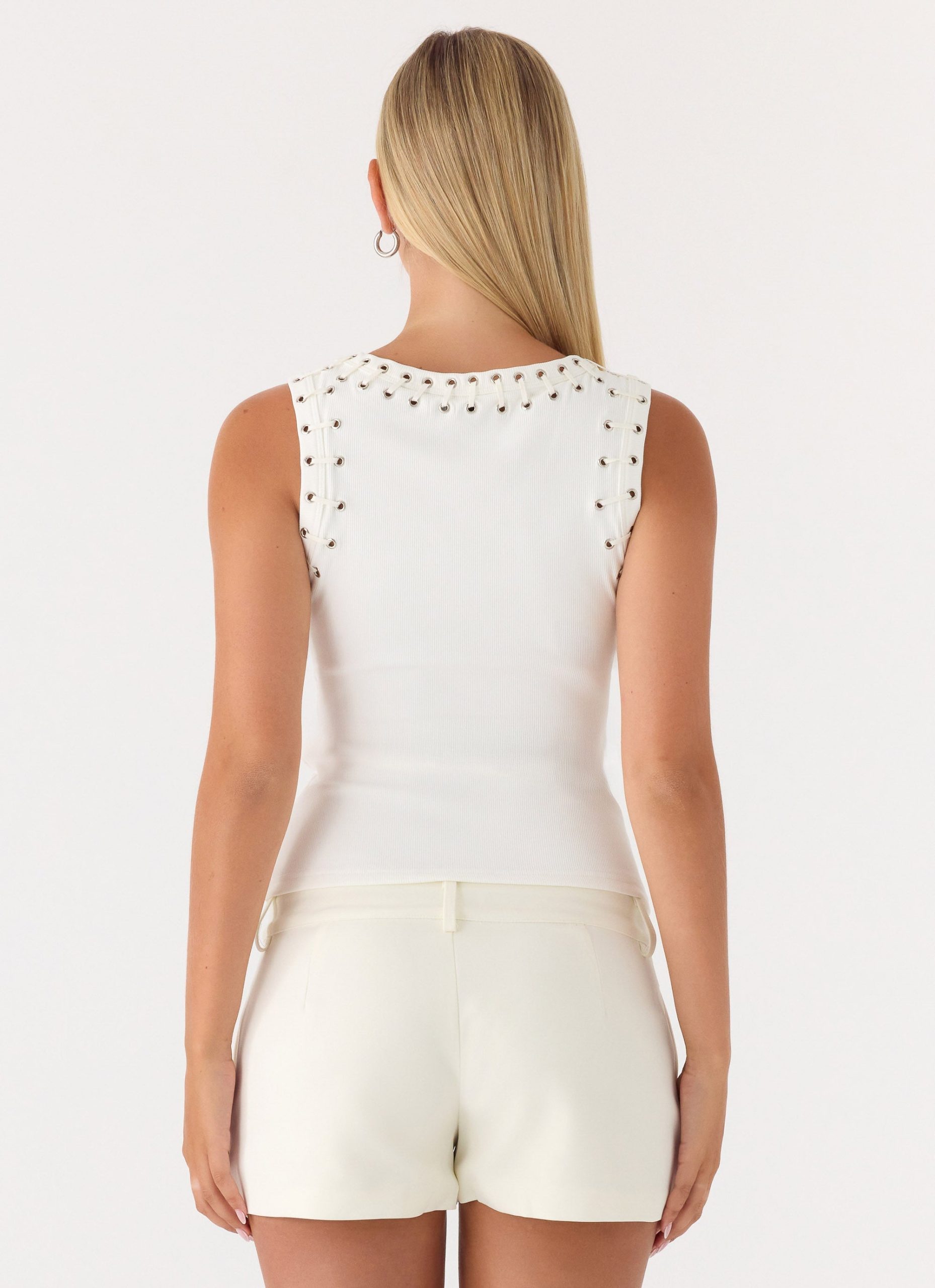 The Play For It Top is made for sunlit afternoons that flow effortlessly into evening glow. Featuring a racer tank silhouette with delicate eyelet detailing. this fitted top is crafted in soft ribbed jersey for a flattering. feminine fit. Fully lined for comfort. it’s designed for effortless. editorial style.