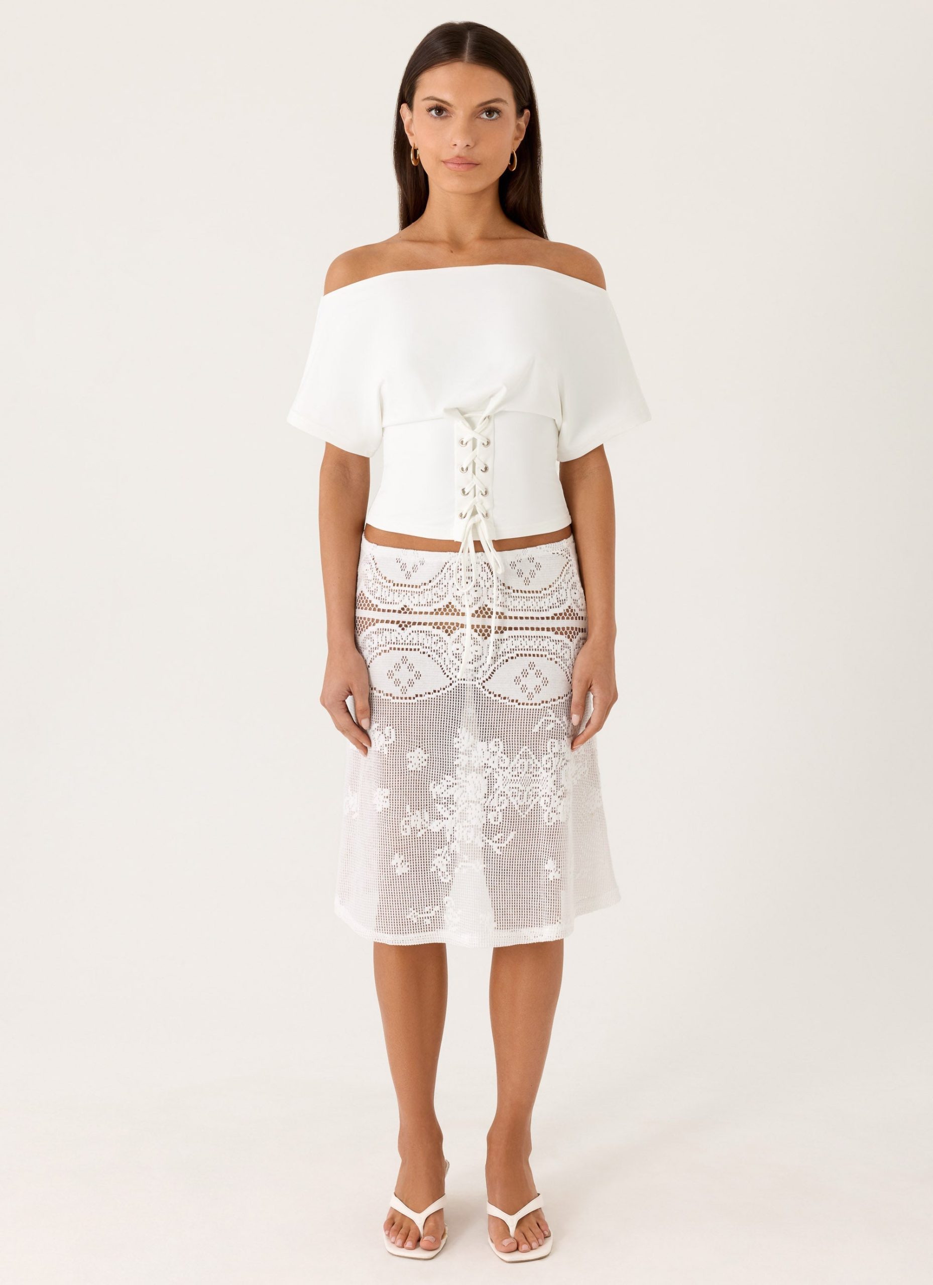 The Rafinha Top is made for effortless sun-drenched style with a flattering off-shoulder silhouette. Featuring short sleeves. a fully lined construction. and an adjustable lace-up waist. it creates a feminine. cinched shape that moves with ease. Perfect for golden hour evenings or breezy daytime moments.