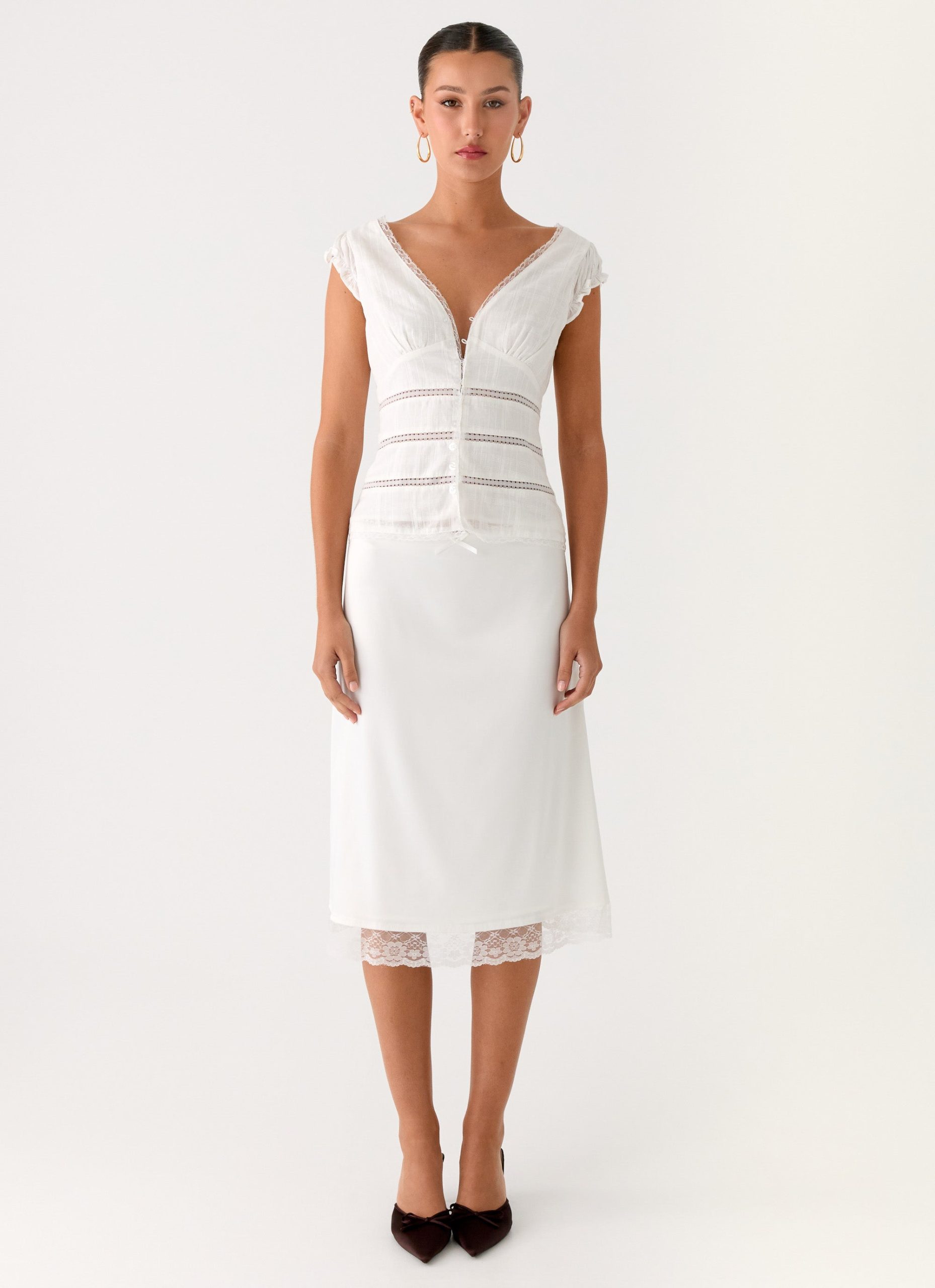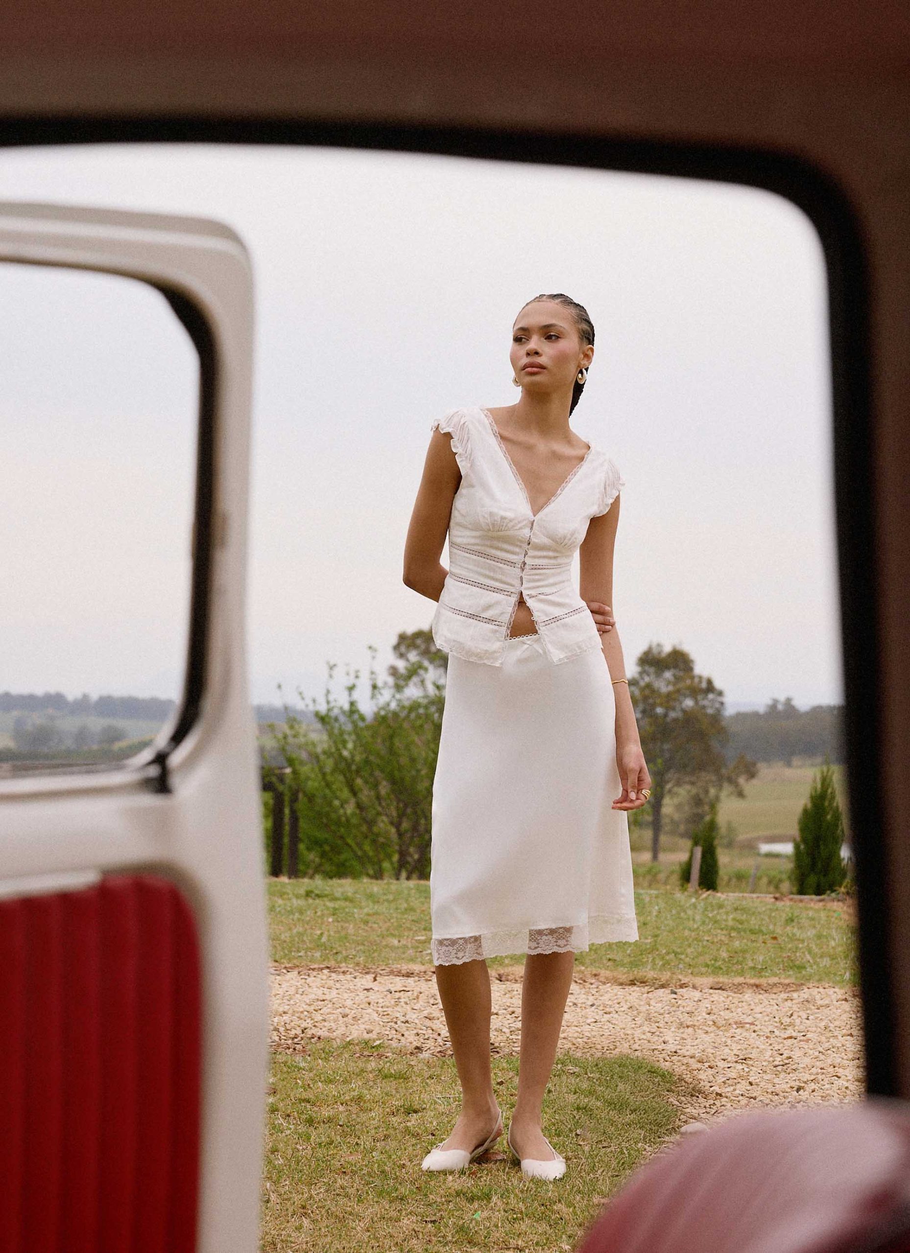 The Ruann Lace Trim Top brings a touch of romance to your day-to-night wardrobe. Featuring a flattering V neckline with delicate button detail. it’s finished with ruffled sleeves and hemline for a soft. feminine silhouette. With an adjustable back strap and fully lined finish. this cotton piece is made for effortless styling from sunshine to golden hour.