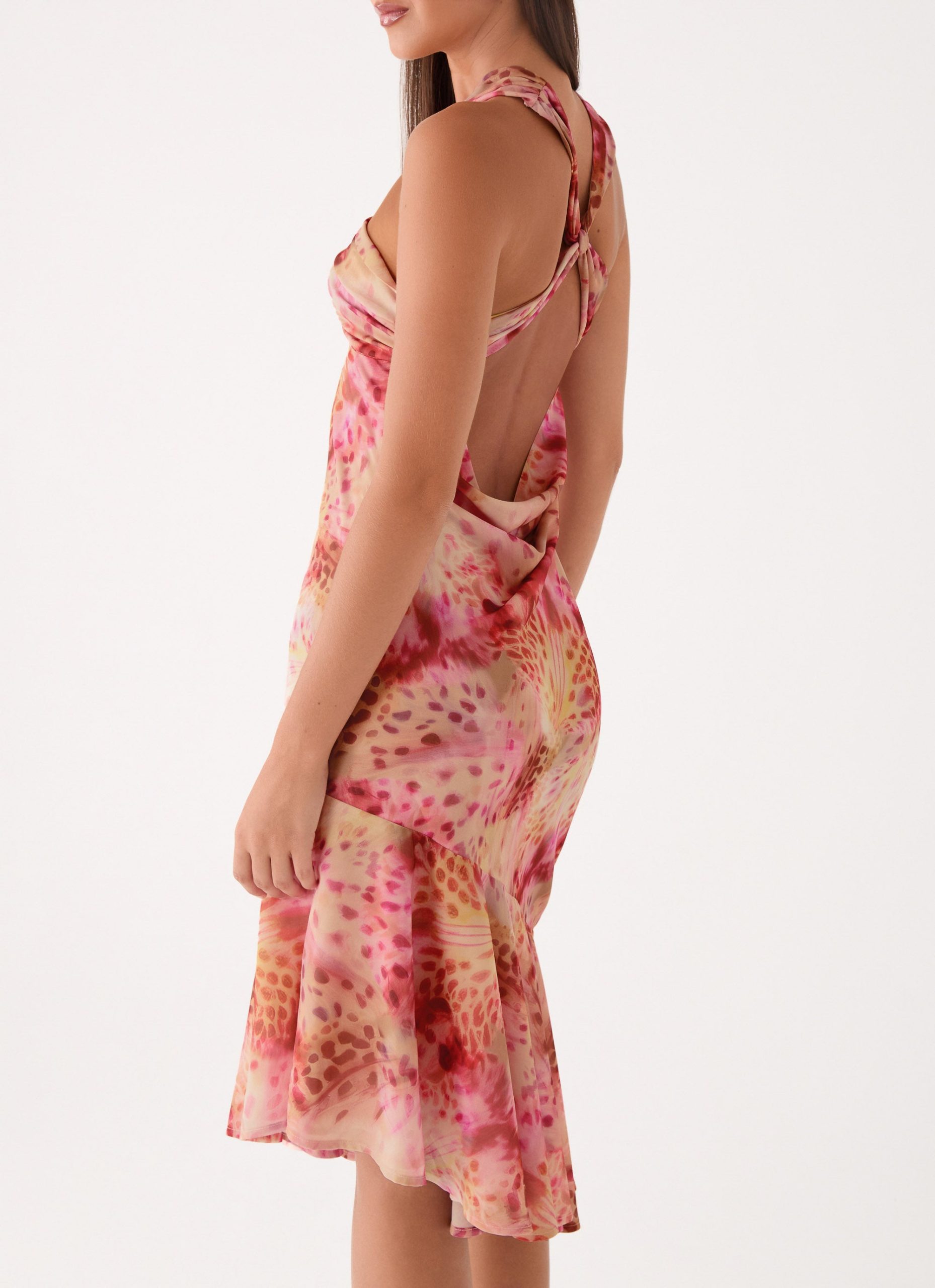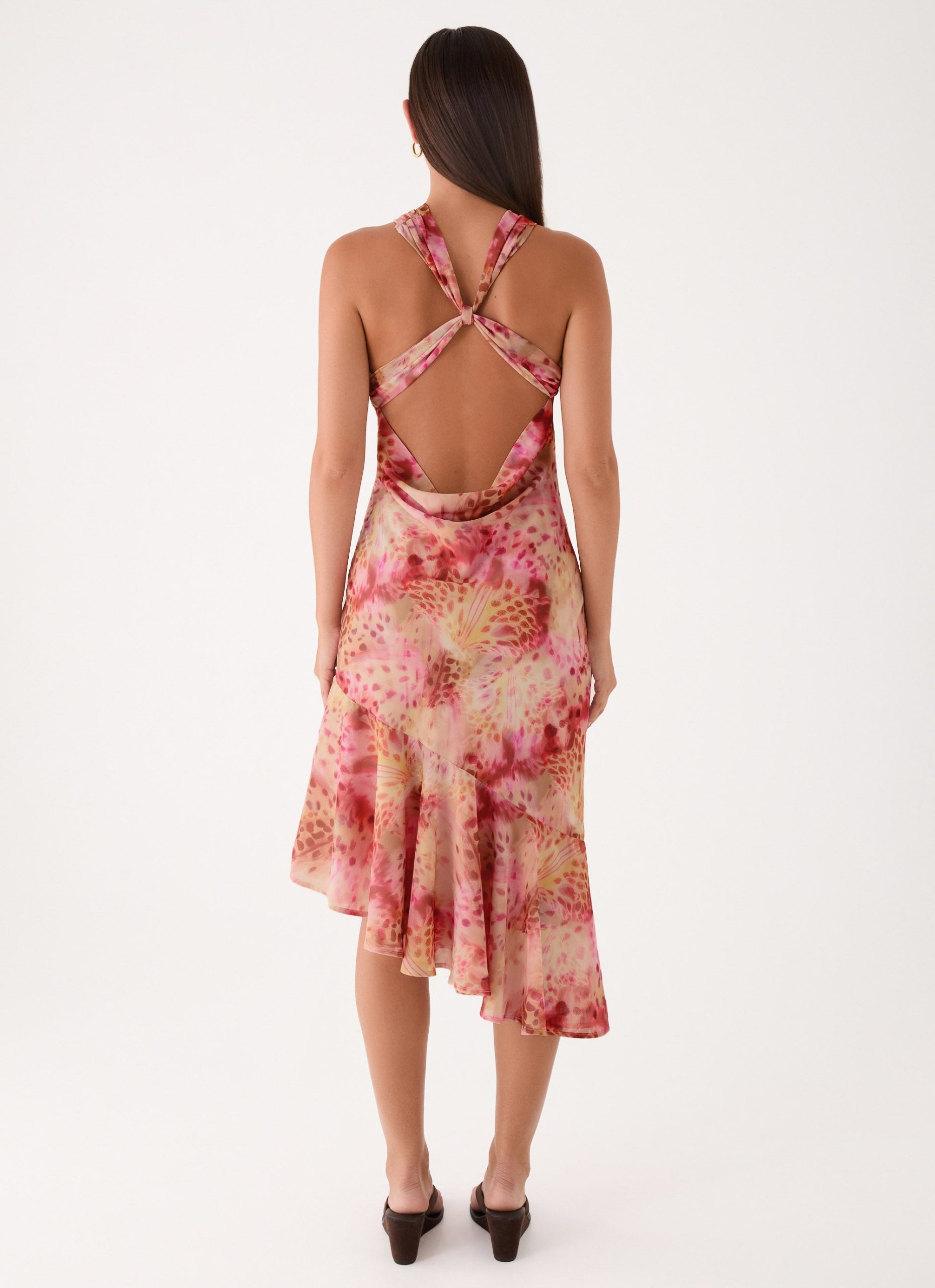 The Sinnie Midi Dress features an elegant fixed knot detail at the bust and a modern asymmetric hem. Crafted from delicate bias-cut chiffon in an exclusive print. this fully lined silhouette offers a fluid. flattering drape that moves with you.