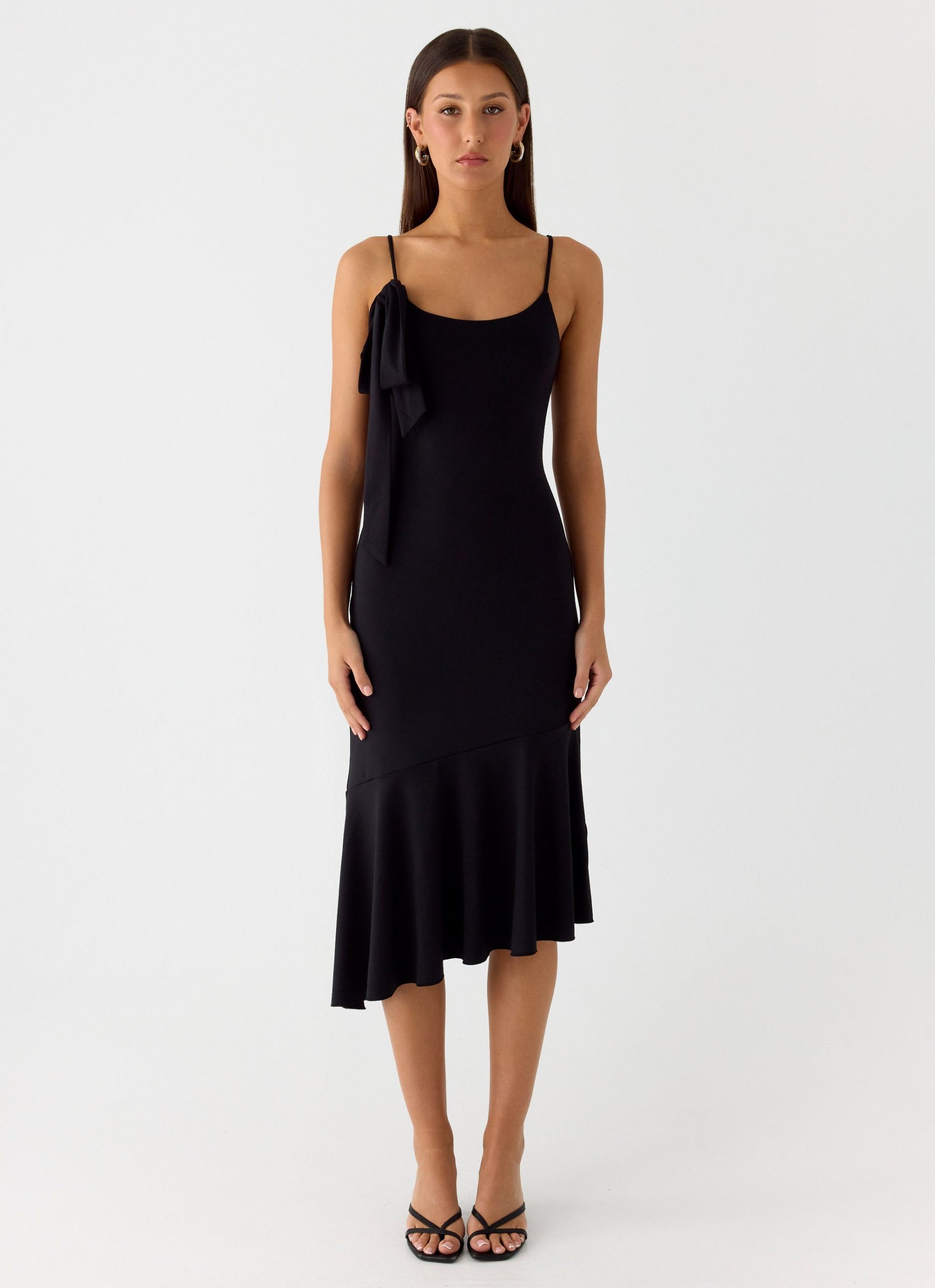 The Tranquility Asymmetric Midi Dress brings a modern romantic vibe to your wardrobe. Featuring delicate floral embellishment and an asymmetrical hemline. this slip-on style is cut from stretch jersey for a figure-hugging fit.