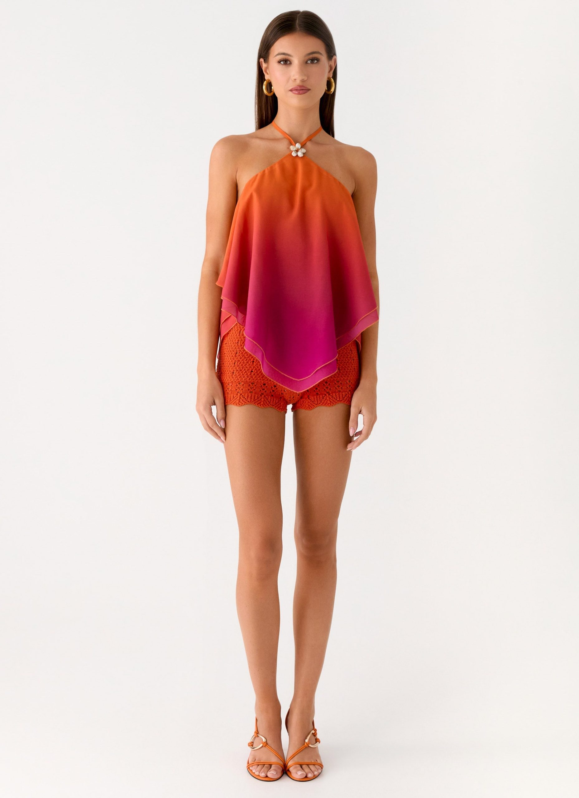 The Twin Flame Top is made for sunset-to-sundown glamour with a feminine. layered silhouette. Featuring a halter neckline. front hardware. and tiered layers. this fully lined top is finished with an open back and crafted in an exclusive print for effortless styling.
