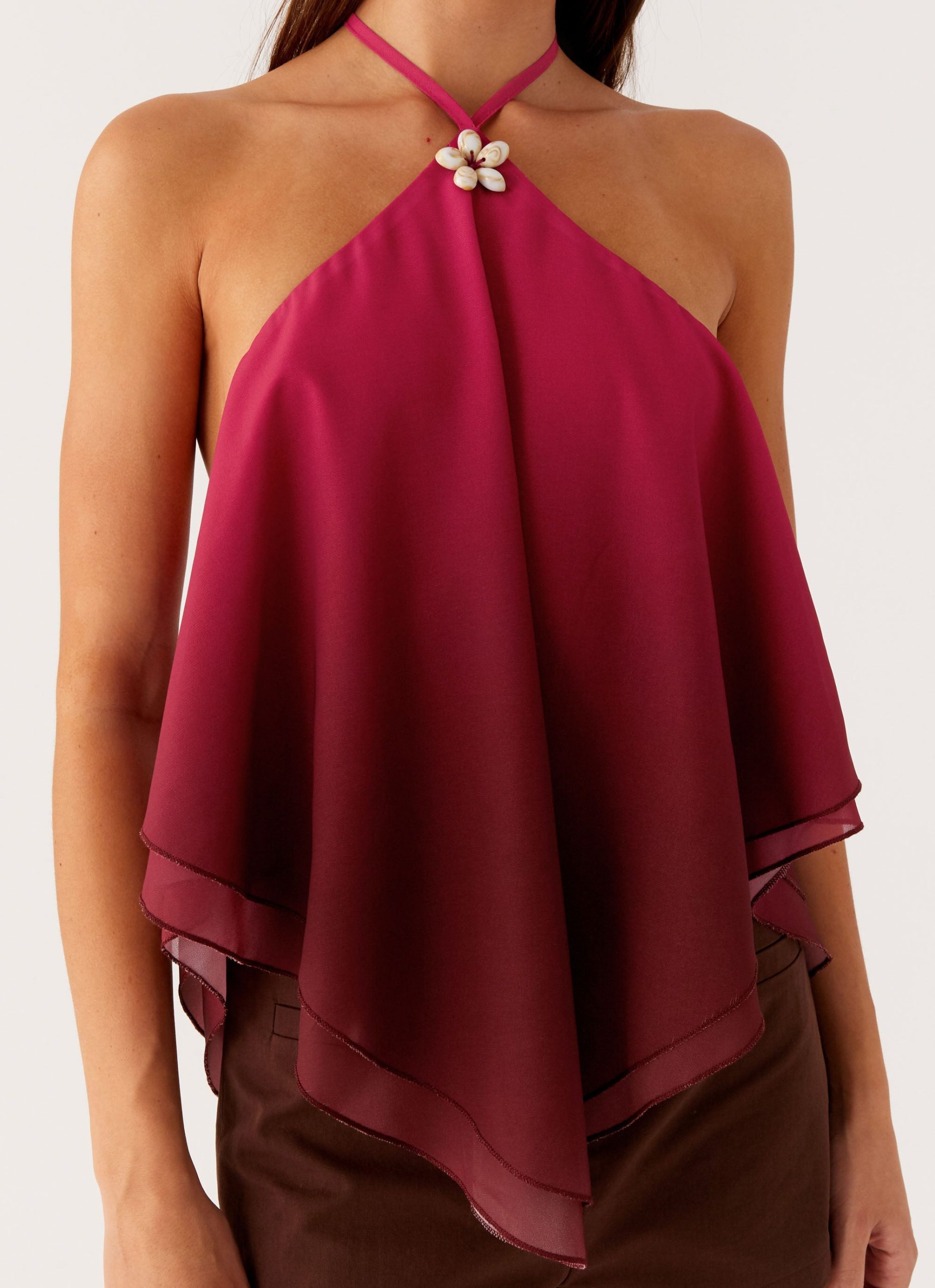 The Twin Flame Top is made for sunset-to-sundown glamour with a feminine. layered silhouette. Featuring a halter neckline. front hardware. and tiered layers. this fully lined top is finished with an open back and crafted in an exclusive print for effortless styling.