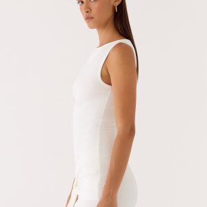 The Vedetta Mini Dress is made for nights that don’t follow the rules. Featuring a sophisticated rounded halter neckline and a daring low back. this fitted silhouette is defined by its chic ruched sash detailing across the front. Crafted from a soft. stretch ribbed jersey that effortlessly hugs the body in a beautiful ivory hue. it’s the ultimate statement piece for bold. after-dark energy and golden hour cocktails.