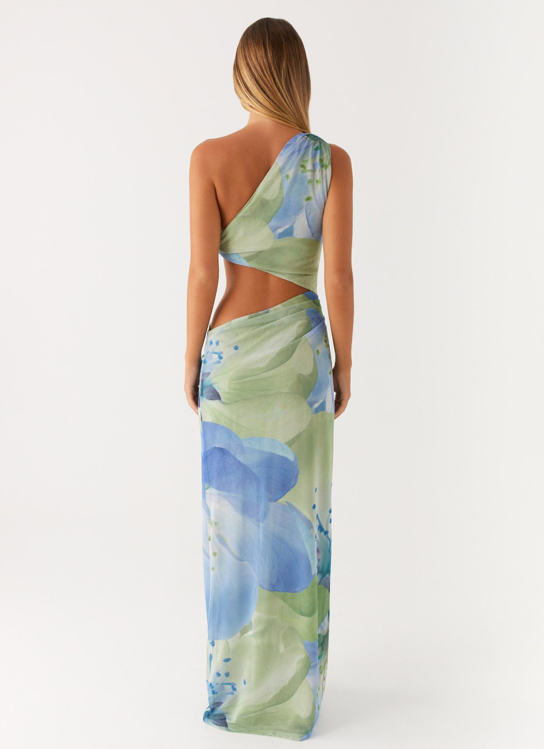 The Wilder Maxi Dress offers a flattering maxi length with ruched sides that accentuate the silhouette. It features an exclusive Peppermayo print. perfect for making a bold statement with a touch of style.