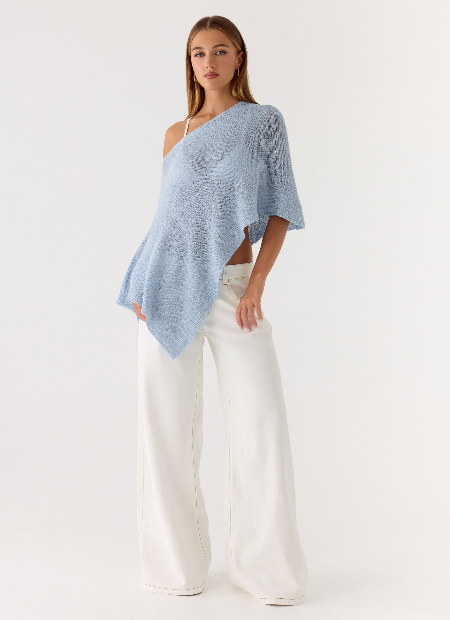 The Yas Knit Cape brings an elevated edge to your layering rotation with its fluid drape and asymmetrical neckline. Designed in a semi-sheer knit. it falls effortlessly over the body for a soft. statement silhouette. Perfect for styling across seasons. this piece adds dimension and movement to any look.